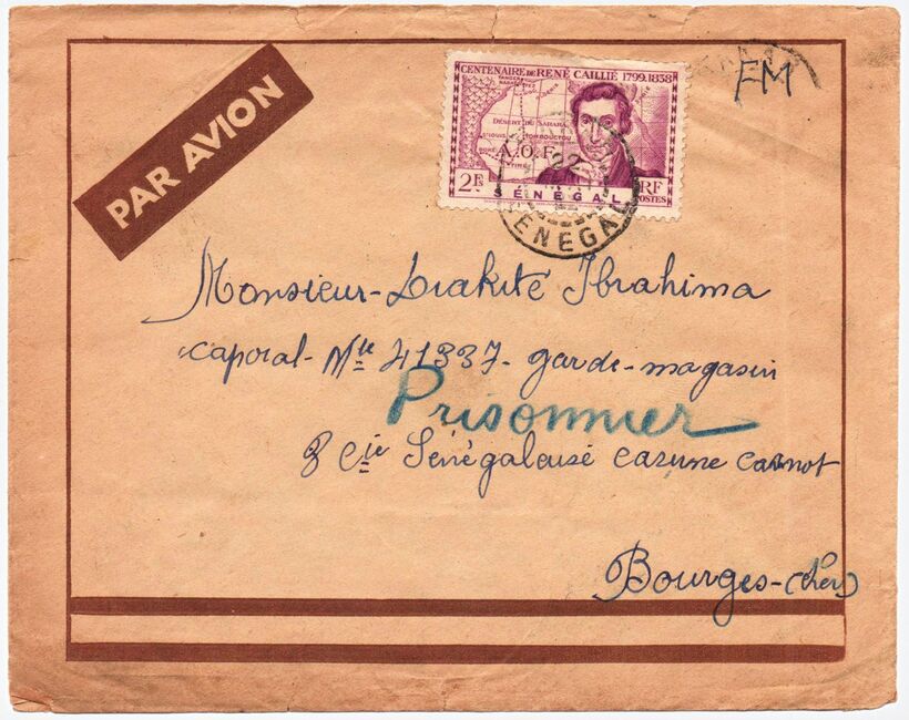 Enveloppe envoyée par avion de Dakar le 22 mai 1941 à un soldat fait prisonnier par les allemands, passée en transit à Marseille le 25 mai 1941. La lettre étant un courrier de prisonnier de guerre (un soldat colonial sénégalais, probablement détenu en Frontstalag sur le sol français), elle a pu exceptionnellement traverser la ligne de démarcation. Elle a été contrôlée par la censure allemande à Paris qui a apposé son cachet Geprüft Dienstelle Feldpost Nr. 21476 B.
