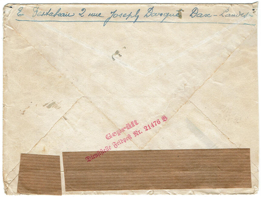 Lettre envoyée de Dax (Landes) le 1er janvier 1941 à destination de Paris puis redirigée vers le consulat de France à Jersey. La lettre a alors été contrôlée par la censure allemande à Paris qui a apposé son cachet Geprüft Dienstelle Feldpost Nr. 21476 B.