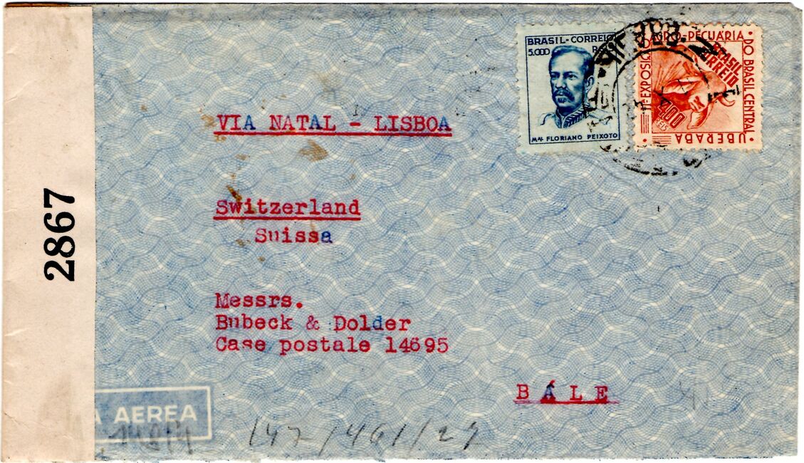 Enveloppe envoyée de Buenos Aires (Brésil) le 1er octobre 1942 vers la Suisse, contrôlée en transit par l'ABP Paris avec cachet d'unité Dienstelle Feldpost Nr. 24052D sur bande Oberkommando der Wehrmacht E avec ses tâches rouges caractéristiques de l'utilisation à Paris.<