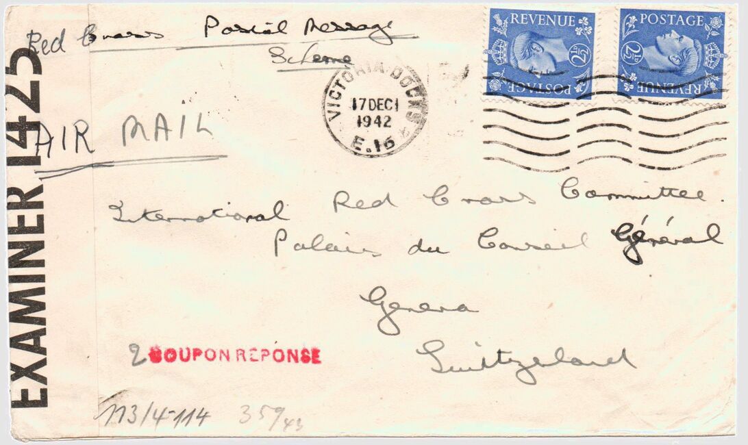 Enveloppe envoyée de Victoria Docks (UK) le 17 décembre 1942 vers la Suisse, contrôlée en transit par l'ABP Paris avec griffe Geprüft Dienstelle Feldpost 24052D sur bande Oberkommando der Wehrmacht X.