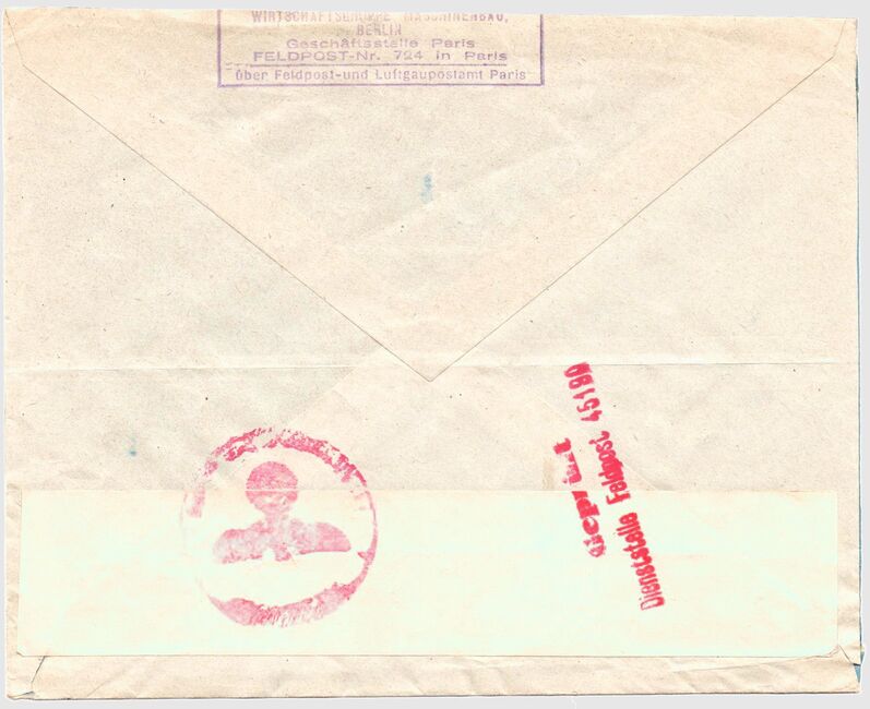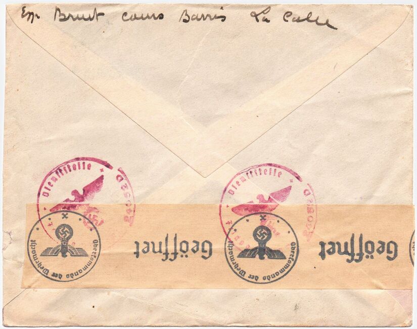Enveloppe envoyée de Paris le 21 avril 1942 via le service Durch Deutsche Feldpost et contrôlée par la censure allemande à Paris qui a apposé son cachet Geprüft Dienstelle Feldpost 45190.