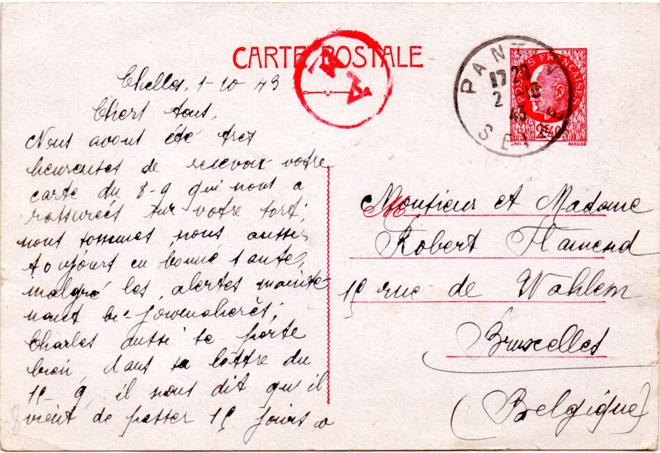 Carte postale envoyée de Pantin le 17 octobre 1943 à destination de la Belgique et contrôlée en transit par l'ABP Paris qui a apposé un cachet Ax rouge.