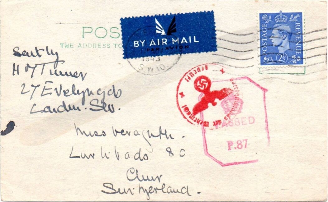 Carte postale envoyée du Royaume-Uni le 17 novembre 1943 à destination de la Suisse et contrôlée en transit par l'ABP Paris. En plus du cachet Oberkommando der Wehrmacht avec la lettre x de la commission de Paris, on distingue les traces du révélateur chimique appliqué par le censeur et destiné à faire apparaître d'éventuels messages écrits à l'encre sympathique.
