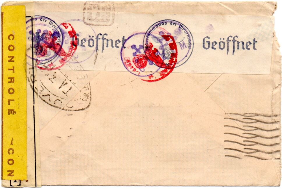 Enveloppe envoyée de Paris le 20 décembre 1940, redirigée vers le consulat de France à Jersey et contrôlée par la censure allemande à Paris qui a apposé son cachet Geprüft Dienstelle Feldpost Nr. 21476 B. La mention mansucrite indique que l'enveloppe est parvenue à destination le 13 février 1941.