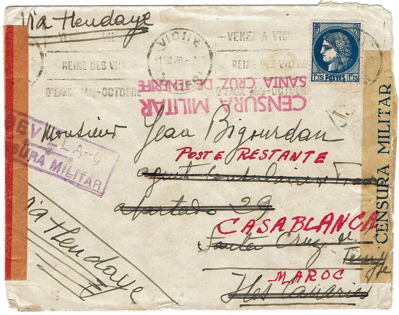 Lettre envoyée le 11 août 1938 de Vichy (Allier) à destination de Santa-Cruz de Tenerife (Iles Canaries) avec double censure espagnole de Seville et de Santa-Cruz de Tenerife. La lettre a été réexpédiée en poste restante vers le Maroc où elle est arrivée le 11 septembre 1938.