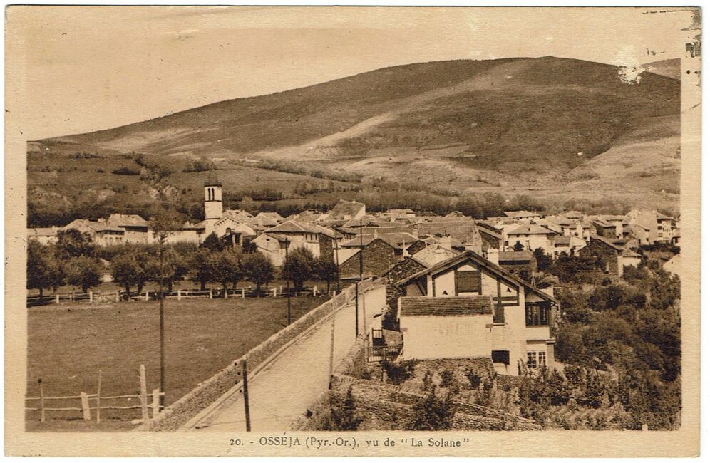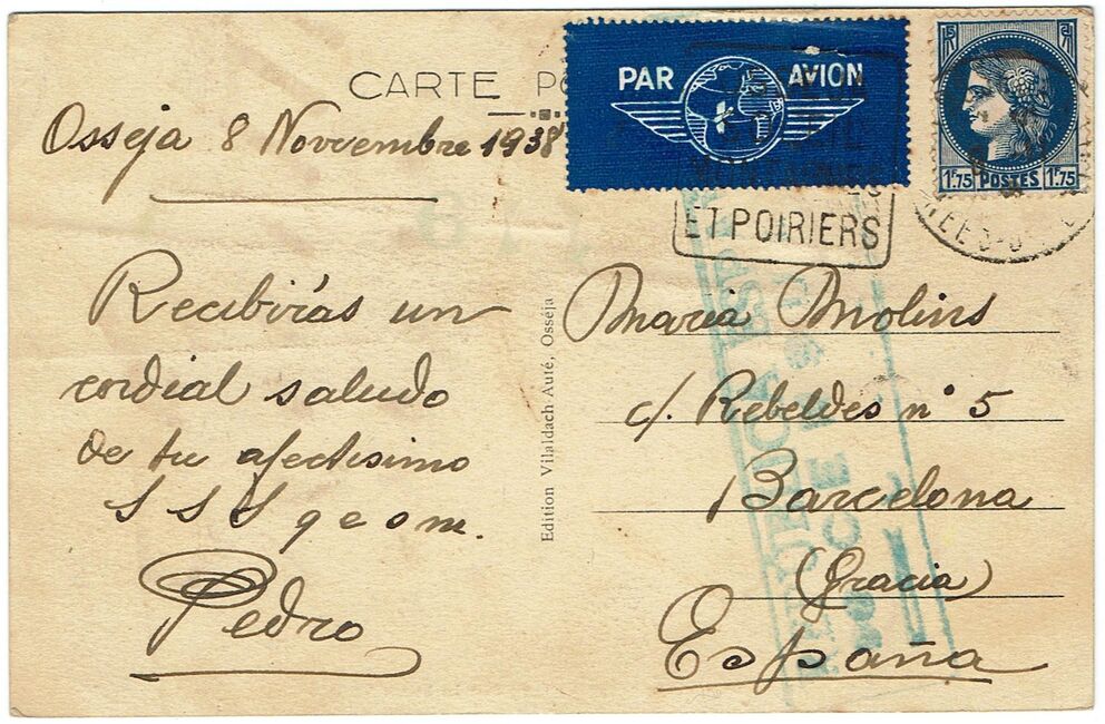 Carte postale envoyée par avion le 8 novembre 1938 d’Osséja (Pyrénées-Orientales) à destination de Barcelone avec censure espagnole « Carteria » de Barcelone.