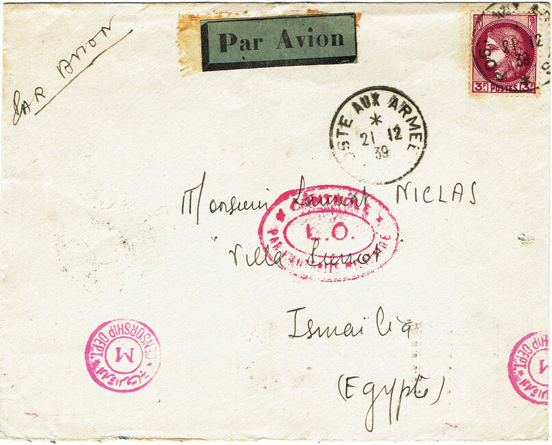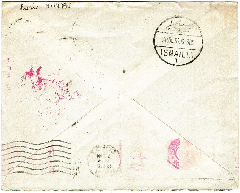 Lettre envoyée le 21 décembre 1939 à destination de l’Egypte avec double censure du Levant (contrôle L0 de Beyrouth) et égyptienne.