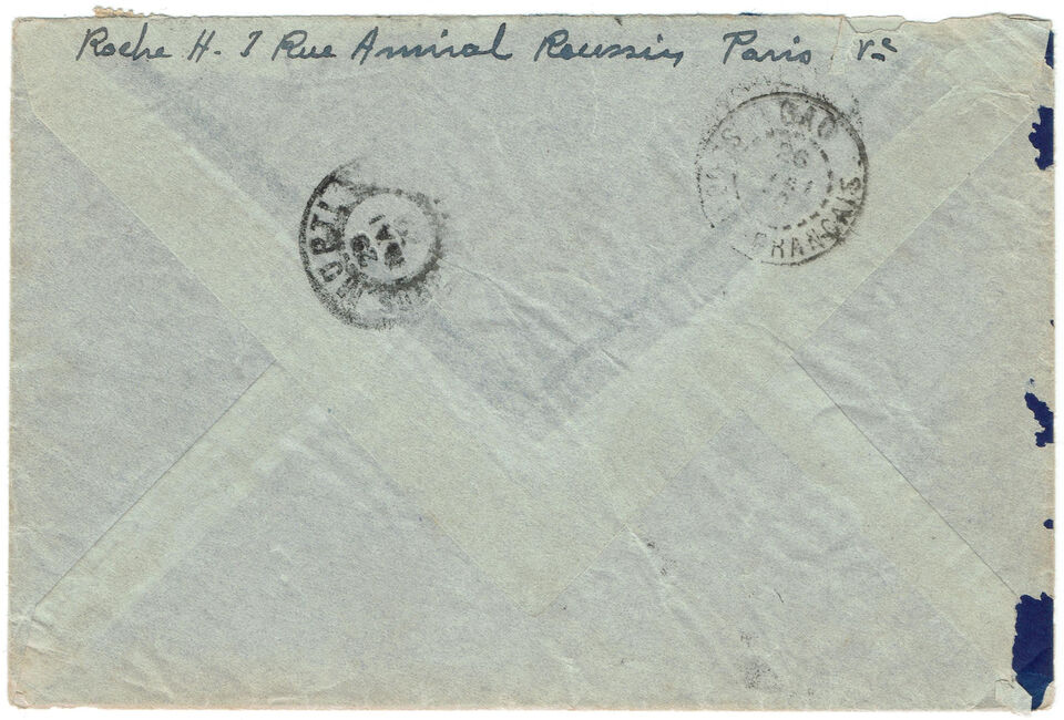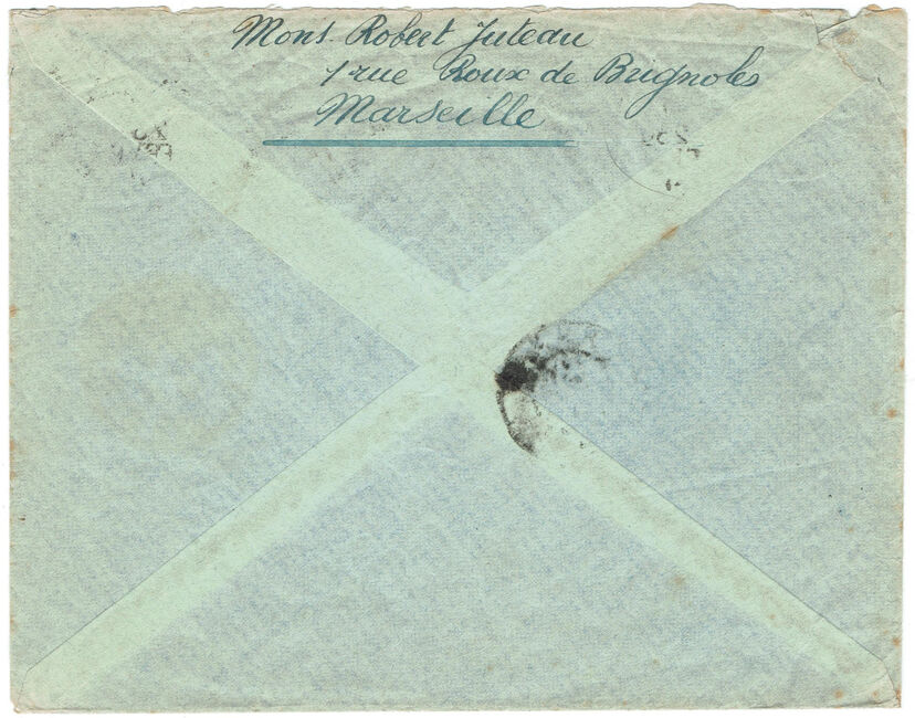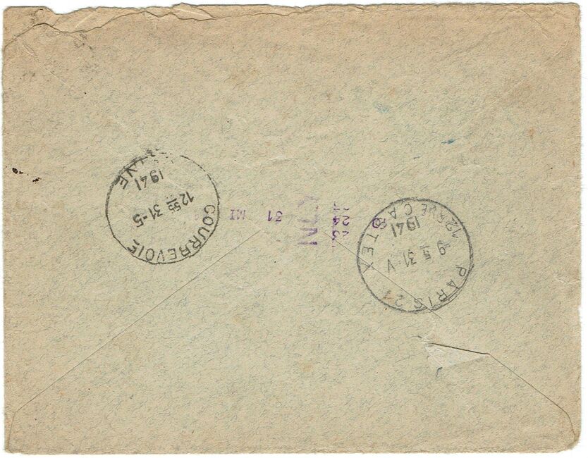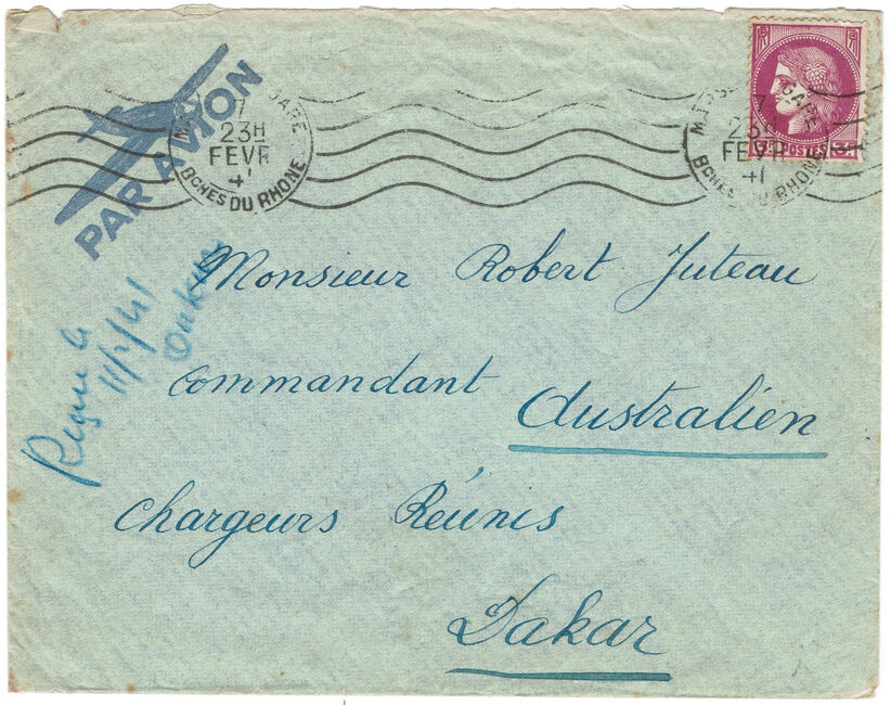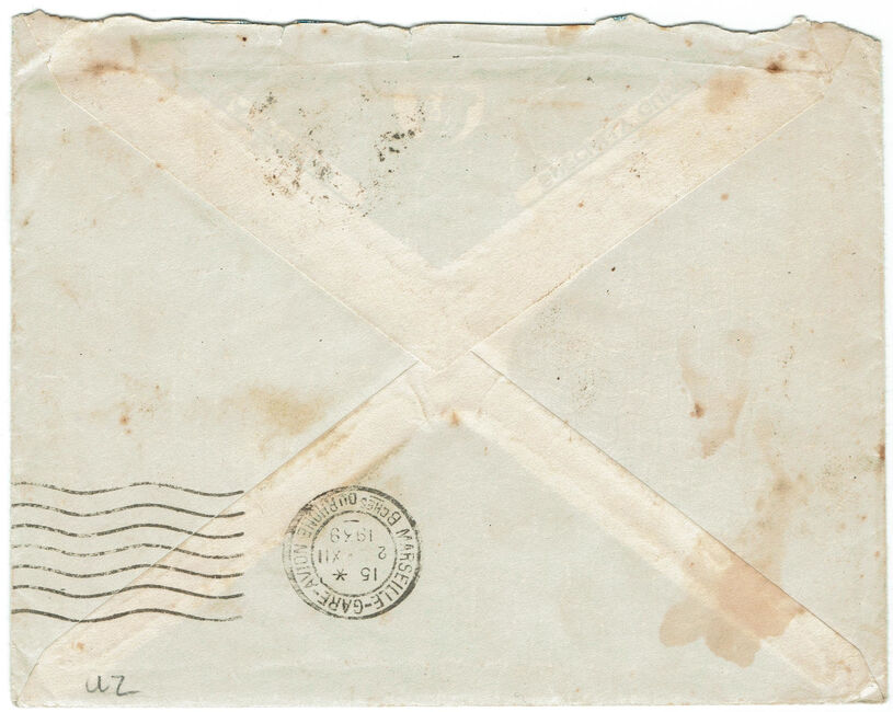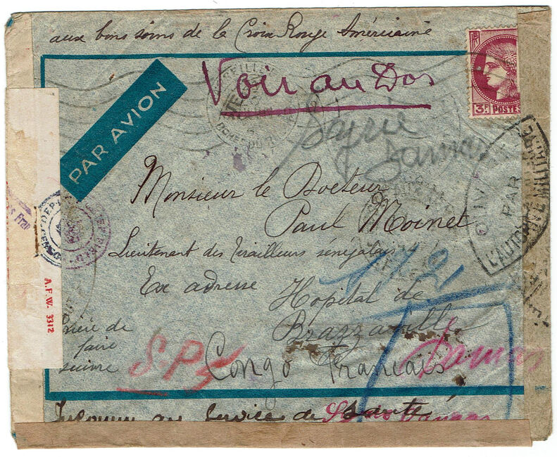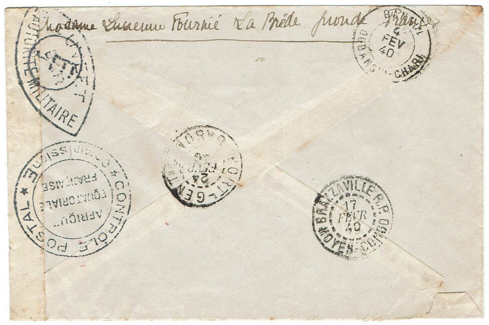 Lettre envoyée de Marseille le 23 juin 1941 à destination de Marseille à destination de Brazzaville (A.E.F.) alors colonie ralliée à la France Libre du général de Gaulle. La lettre a été réexpédiée vers le secteur postal 2 de Damas (Syrie, Levant français sous contrôle des Forces Françaises Libres) via le bureau postal militaire 1 du Caire (cachets F.F.L. - 1 du 3 février 1942 et F.F.L. - 2 du 13 février 1942) puis vers le secteur postal 5 des F.F.L. (cachet du 5 mars 1942). La lettre a subit quatre contrôles postaux successifs : le contrôle postal de l’A.O.F. Vichyste, celui de l’A.E.F. ralliée à la France Libre, le contrôle postal britannique du Caire et un contrôle des Forces Françaises Libres en partie arraché.