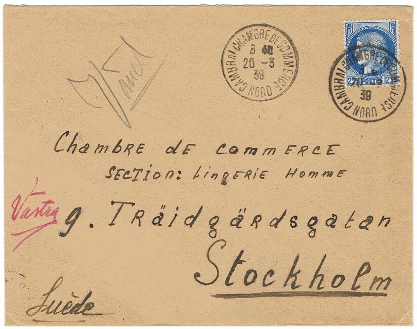 Lettre envoyée le 20 mars 1939 du bureau de Cambrai chambre de commerce (Nord) à destination de Stockholm (Suède)