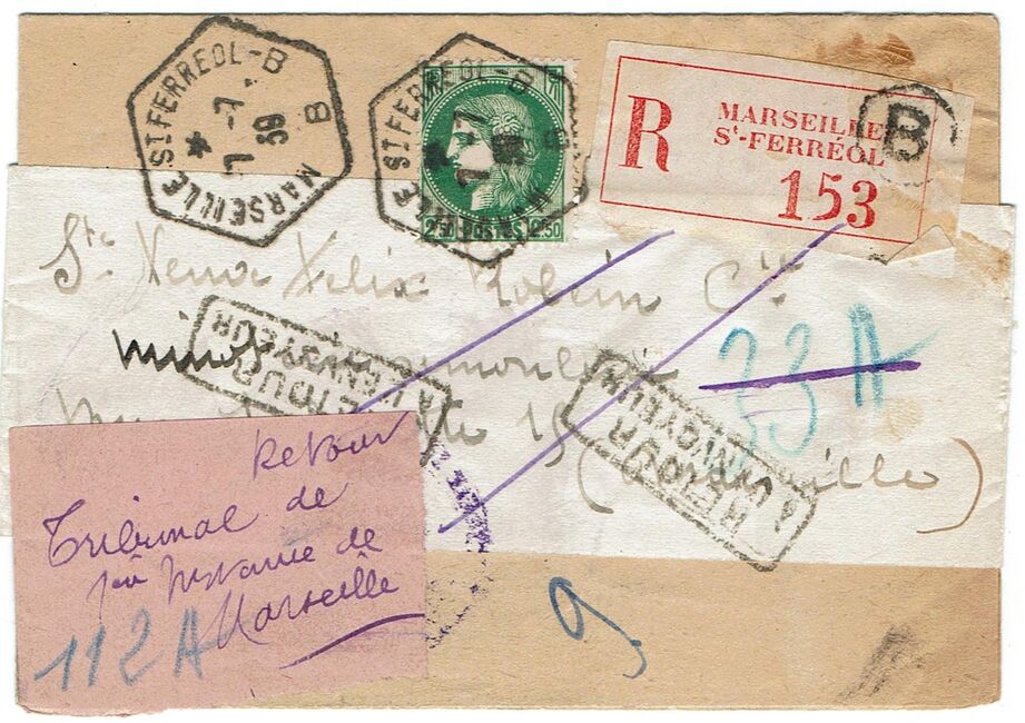 Lettre recommandée envoyée de l’agence postale Marseille Saint-Ferréol B le 7 juillet 1939, à destination de Marseille.