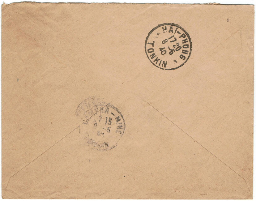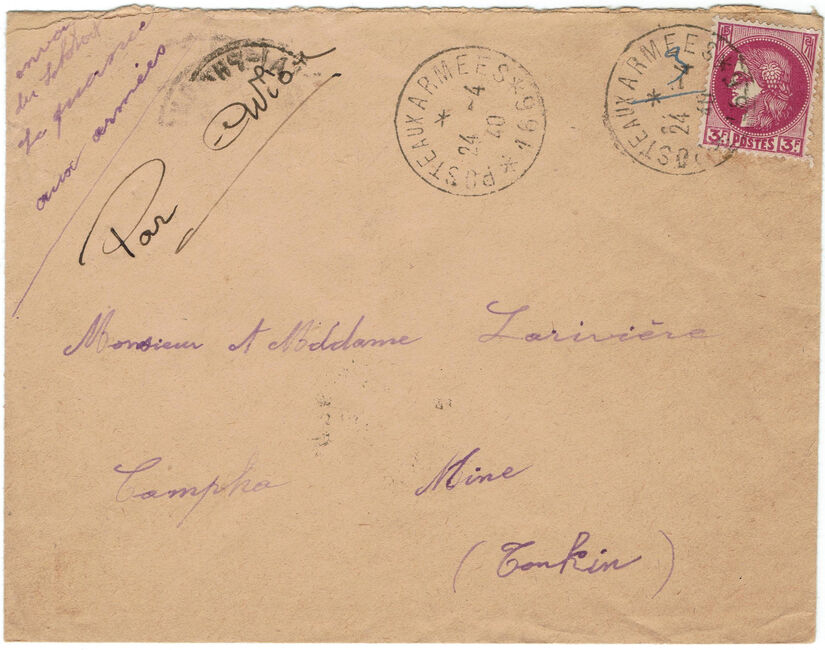 Lettre envoyée le 24 avril 1940 en franchise militaire par avion par un soldat du secteur postal 166 (3e division d’infanterie coloniale) à destination des mines de Cam Pha en Indochine française. L’affranchissement correspond à l’acheminement par avion Air France de métropole vers l’Indochine.