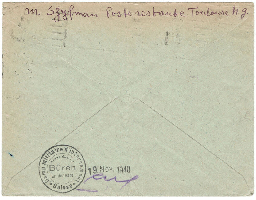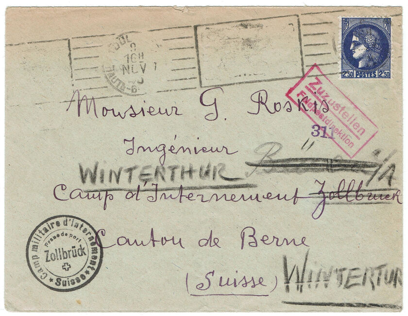 Enveloppe envoyée de Toulouse le 9 novembre 1940 à un civil interné au camp de Zollbrück (cachet du camp), puis redirigée vers le camp de Büren (cachet du camp au dos et dateur du 19 novembre 1940) et de nouveau redirigée vers Winterthur. Cachet de contrôle Zuzustellen - Feldpostdirektion (A transmettre - Direction de la poste militaire) de la poste militaire Suisse. Le timbre est oblitéré par une flamme grattée de Toulouse, le slogan ayant été retiré après l'armistice.