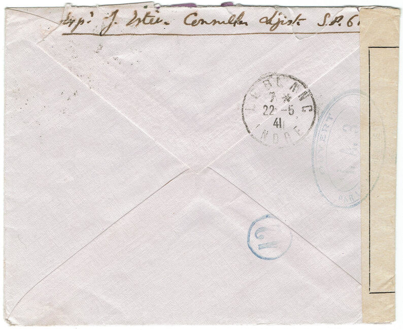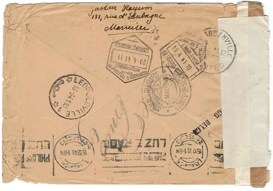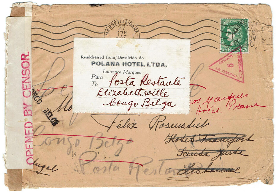 Lettre envoyée le 27 novembre 1940 de Marseille (Bouches-du-Rhône) à destination de Lisbonne où elle arrive le 15 décembre 1940, réexpédiée vers Léopoldville (Congo Belge) où elle transite 16 mars 1941 avec passage par le contrôle postal du Congo Belge, puis vers Lourenço Marqès (Mozambique) le 19 avril 1941 et enfin vers Elisabethville via l’Angola (transit le 2 mai 1941). Durant ce périple, la lettre a été ouverte une seconde fois par le contrôle postal de Rhodésie du Sud.