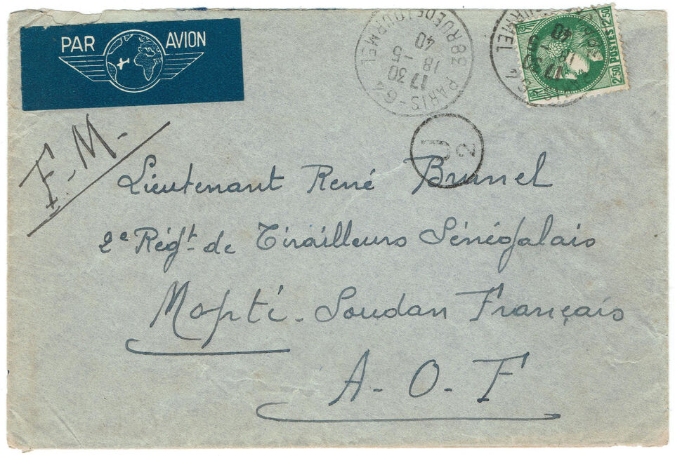 Lettre envoyée par avion en franchise militaire de Paris le 18 mai 1940 à destination d’un militaire stationné à Mopti (Soudan français) en AOF.