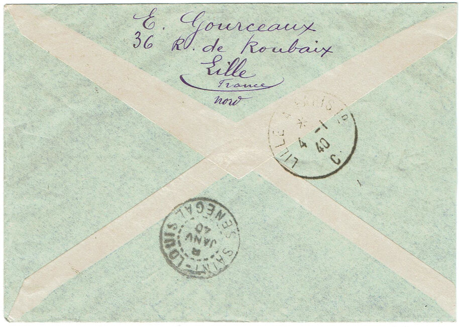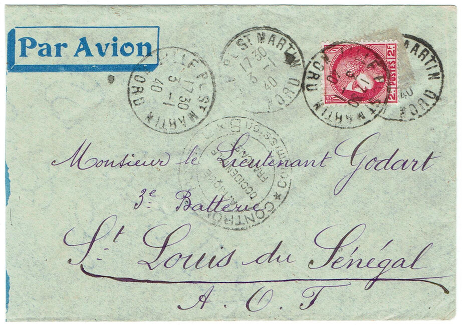 Lettre envoyée en franchise militaire par avion le 3 janvier 1940 à destination de Saint-Louis du Sénégal avec contrôle postal de la commission B de Saint-Louis.