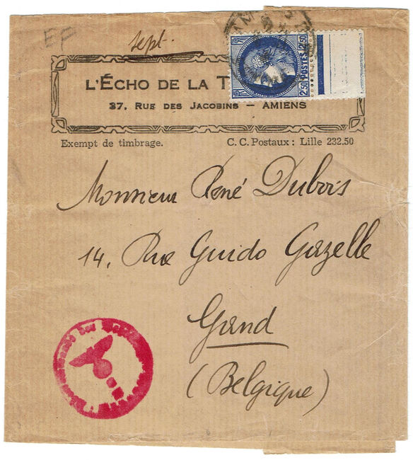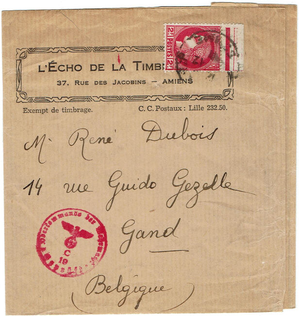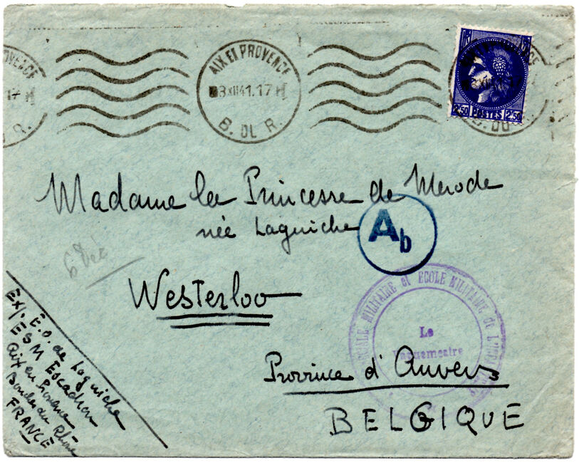 Lettre envoyée le 8 décembre 1941 d’Aix-en-Provence à destination de Westerloo (Belgique) avec passage inhabituel par le centre de contrôle Ab de Berlin, peut-être en raison de la provenance militaire de la lettre.