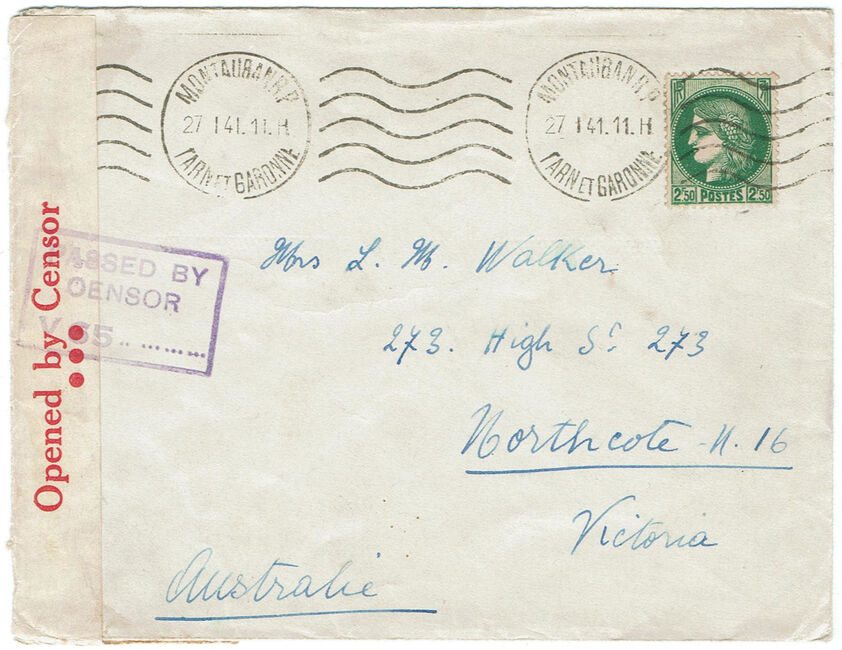 Lettre envoyée le 27 janvier 1941 de Montauban (Tarn-et-Garonne) à destination de Northcote (Australie) avec censure australienne.