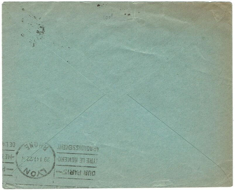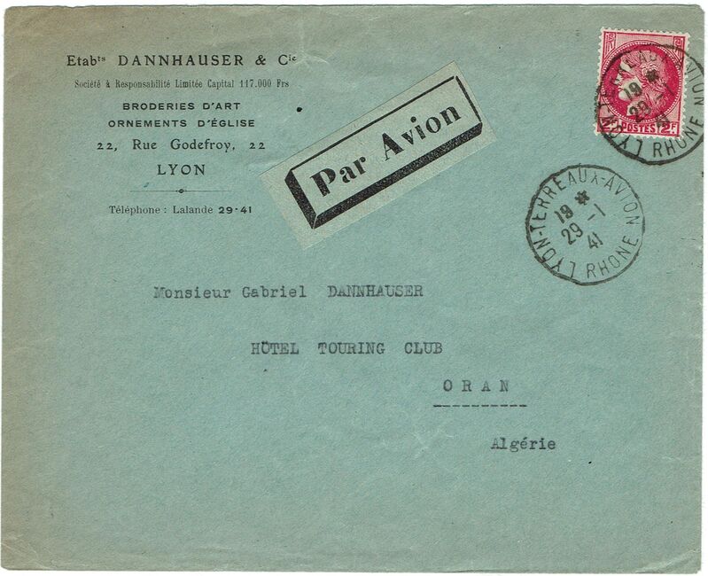 Lettre envoyée par avion le 29 janvier 1941 du bureau de Lyon-Terreaux-avion à destination d’Oran en Algérie.