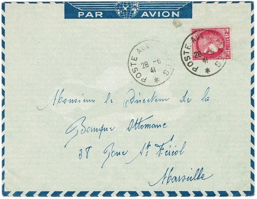 Lettre envoyée par avion le 28 juin 1941 du vaguemestre d’étape 16 (Hama en Syrie) dépendant du secteur postal 612 (Homs en Syrie), à destination de Marseille. A cette date Damas est déjà prise par l’armée britannique et par les F.F.L. au cours de l’opération Exporter.