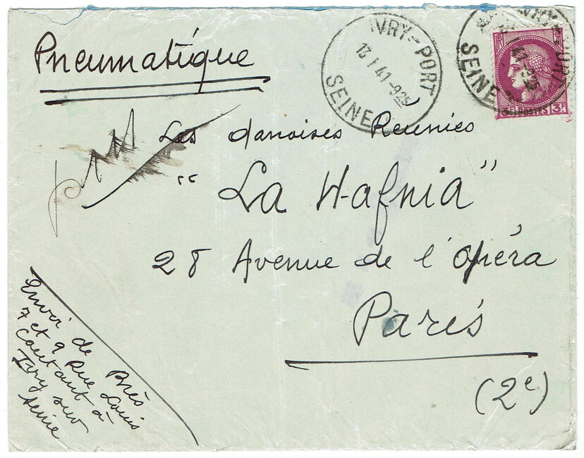 Lettre pneumatique du second échelon envoyée le 13 janvier 1941 d’Ivry-sur-Seine à destination de Paris.