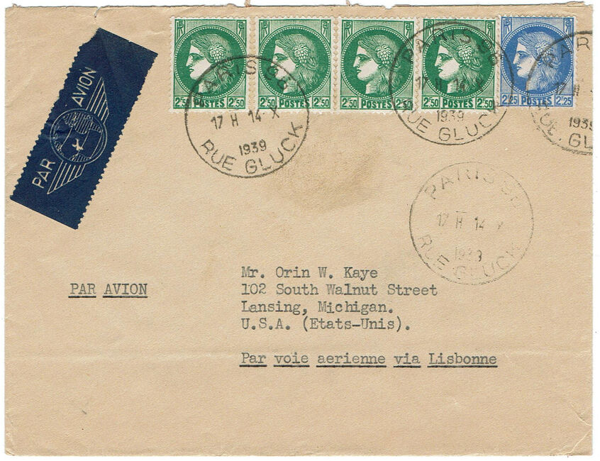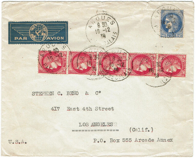 1er échelon (jusqu'à 20 grammes) de la lettre pour l'étranger du 1er décembre 1938 au 31 décembre 1939 : 2,25 F.