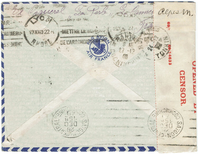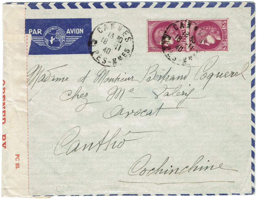 Lettre envoyée le 18 novembre 1940 par avion de Cannes (Alpes-Maritimes) à Canthô (Cochinchine) en Indochine française. L’acheminement par avion est assuré à cet période par la compagnie néerlandaise KLM qui opère une liaison Lydda (Palestine) – Bandoeng (Indes néérlandaises). Le courrier pour l’Indochine est débarqué à Bangkok (Thaïlande) puis acheminé par voie de surface jusqu’en Indochine. La bande de censure britannique de type PC22 a été apposée en Palestine. Cachets de transit à Lyon le 19 novembre 1940, Hanoï RP bis le 24 décembre 1940, Saïgon-central le 26 décembre 1940 et d’arrivée à Canthô le 27 décembre 1940.