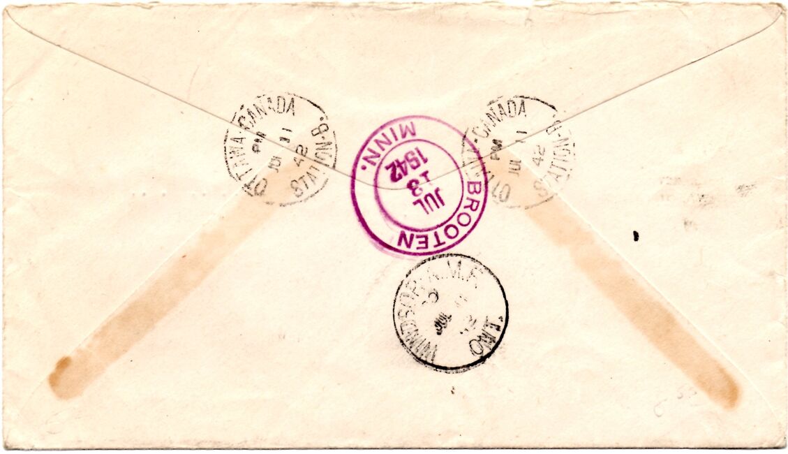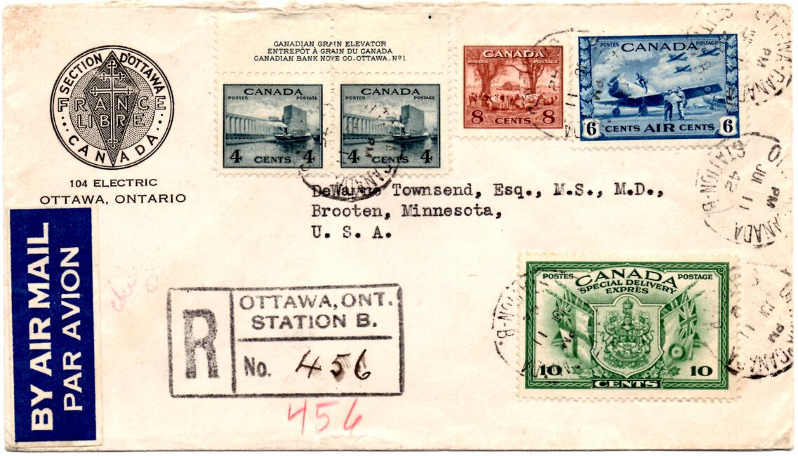 Enveloppe recommandée à en-tête de la France Libre (section d'Ottawa, Canada) envoyée le 11 juillet 1942. Le comité d'Ottawa était un des nombreux comités canadiens.