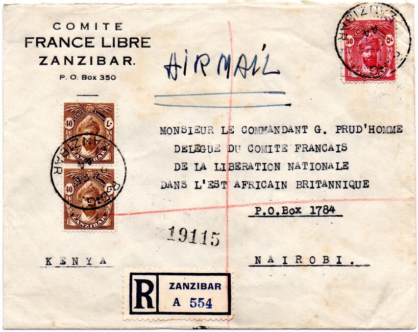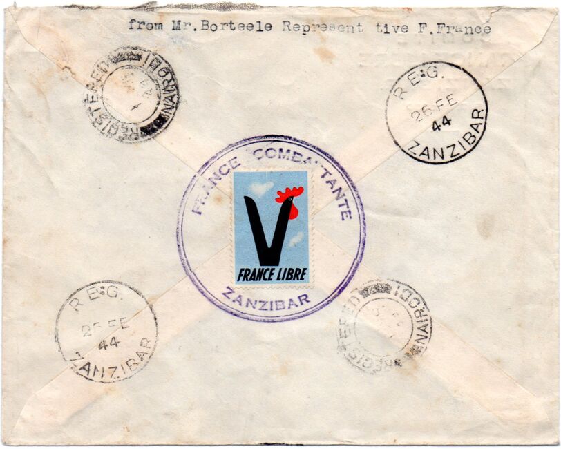 Enveloppe recommandée envoyée du comité France Libre de Zanzibar le 25 février 1944 à destination du délégué du CFLN en Afrique Orientale Britannique. Outre son en-tête du comité, l'enveloppe a au dos un grand cachet circulaire France Combattante Zanzibar et une vignette France Libre.