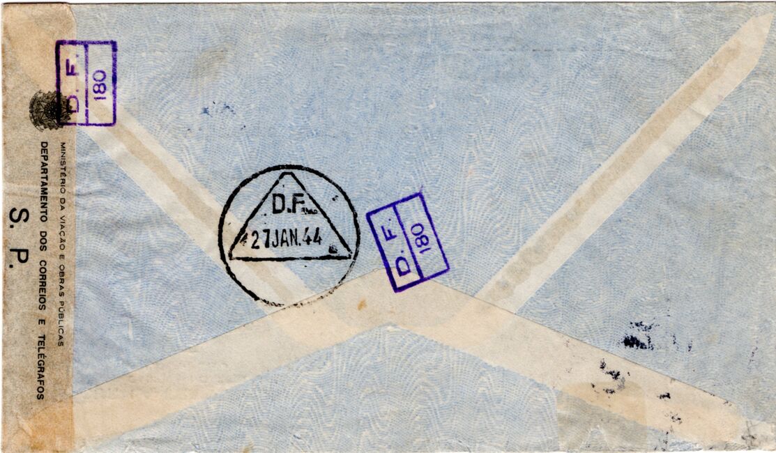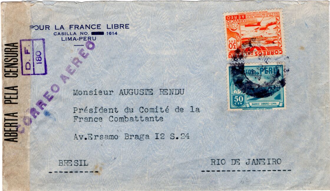 Enveloppe à en-tête du comité France Libre de Lima (Pérou) envoyée le 21 janvier 1944 à destination du président du comité de la France Combattante de Rio de Janeiro. Depuis le 13 juillet 1942, la France Libre est en effet devenue par décision du Comité National Français la France Combattante, mais les comités ont continué à utiliser les enveloppes à en-tête de la France Libre jusqu'à épuisement des stocks.