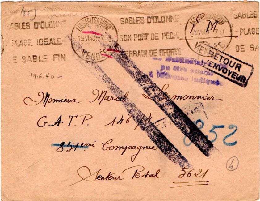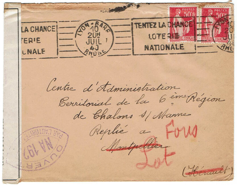 Lettre envoyée le 10 juillet 1940 à destination du Centre d’Administration Territorial de la 6ème région militaire de Châlons-sur-Marne (Marne) replié à Montpellier (Hérault) puis à Fons (Lot) en raison de l’avancée allemande.