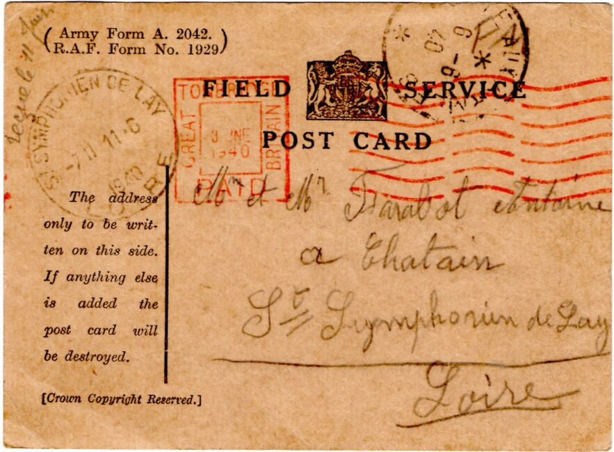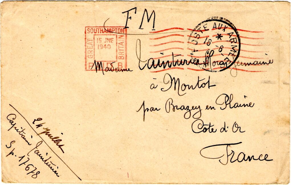 Les courriers présentés ci-dessous ont été envoyés par des soldats français lors de leur passage en Grande-Bretagne. Ils ont une marque de franchise rouge britannique paid avec indication du nom de la ville, et parfois une marque d'acheminement via la poste aux armées françaises.