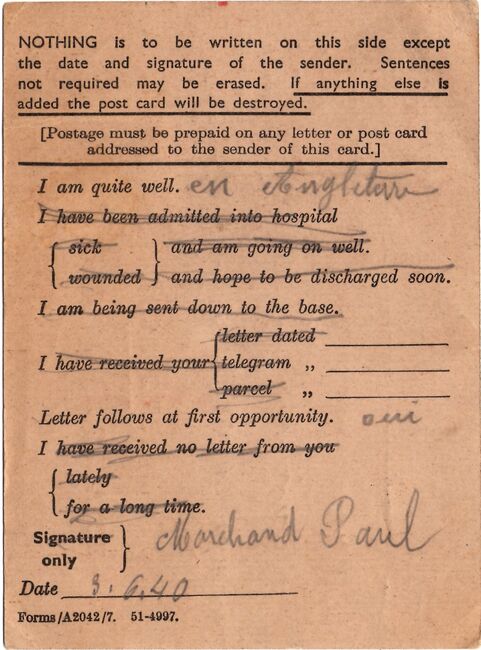 La méthode d'acheminement du courrier des évacués de Grande-Bretagne vers la France n'est pas certaine, mais l'absence de toute marque de contrôle international accrédite l'hypothèse d'un acheminement direct spécial de Grande-Bretagne vers la France. L'hypothèse la plus plausible est la suivante: