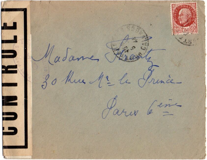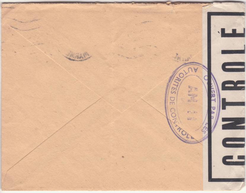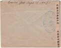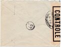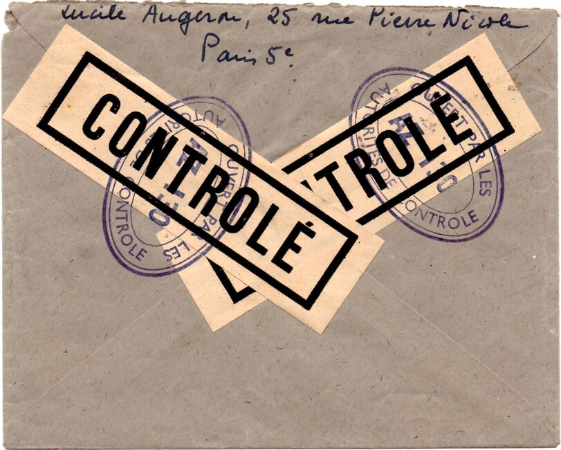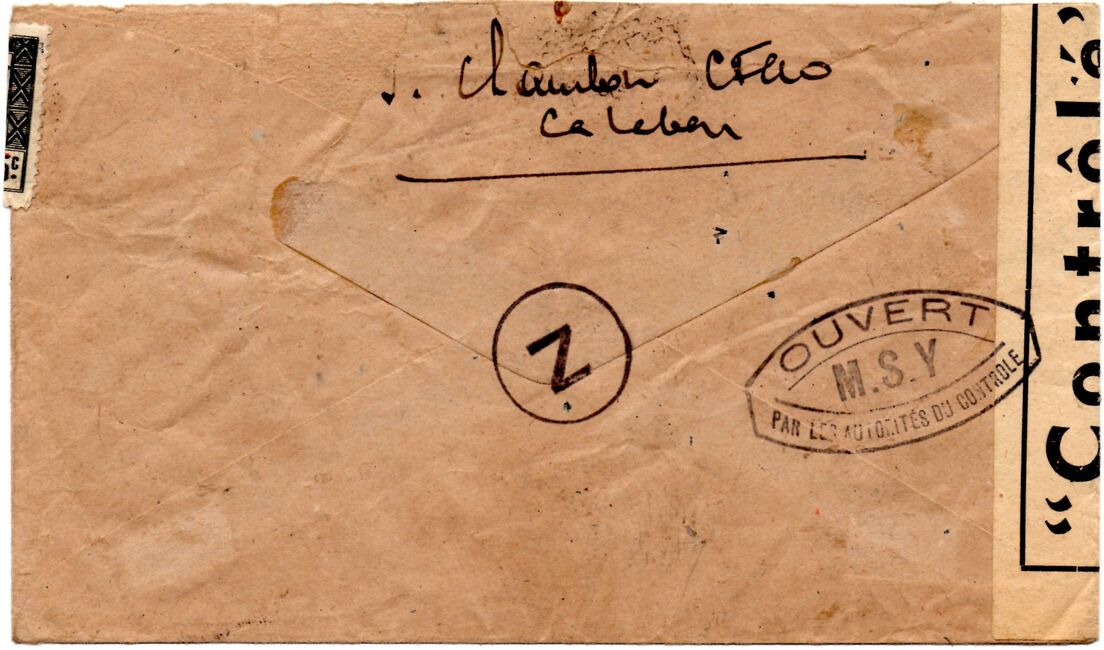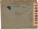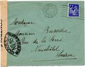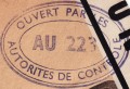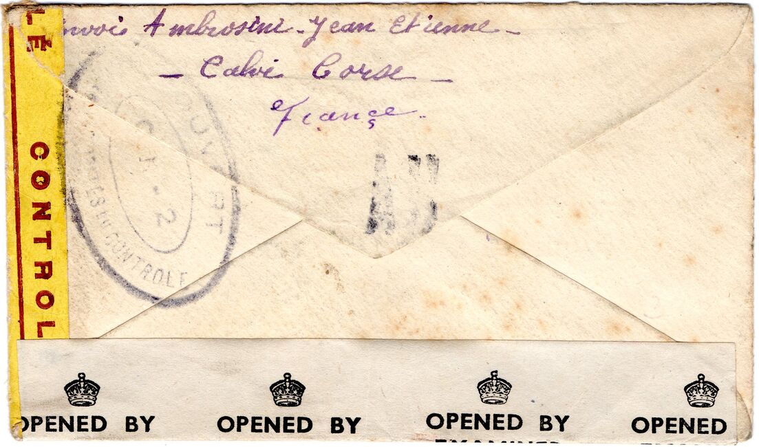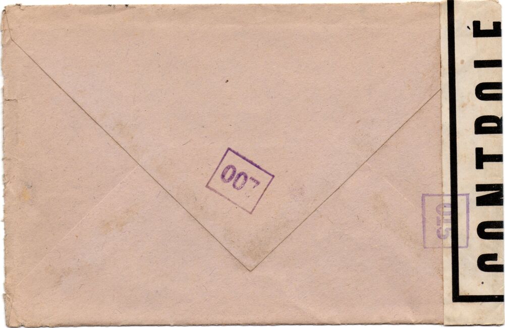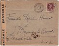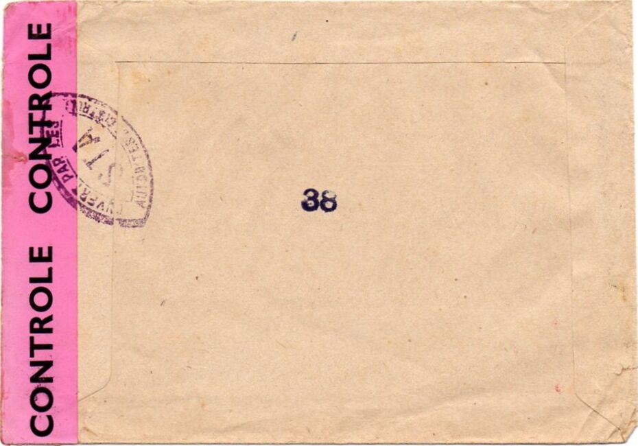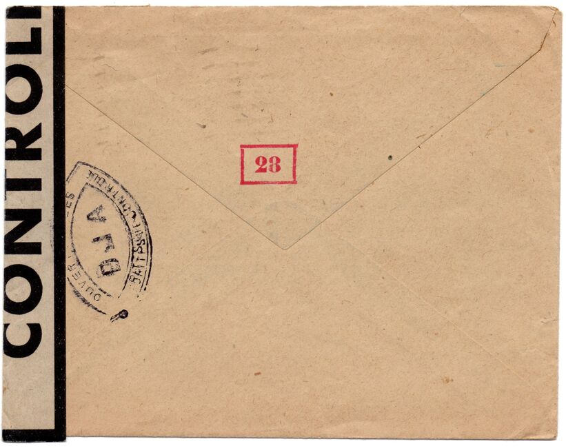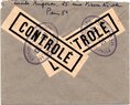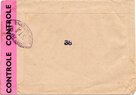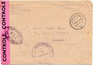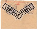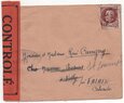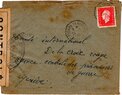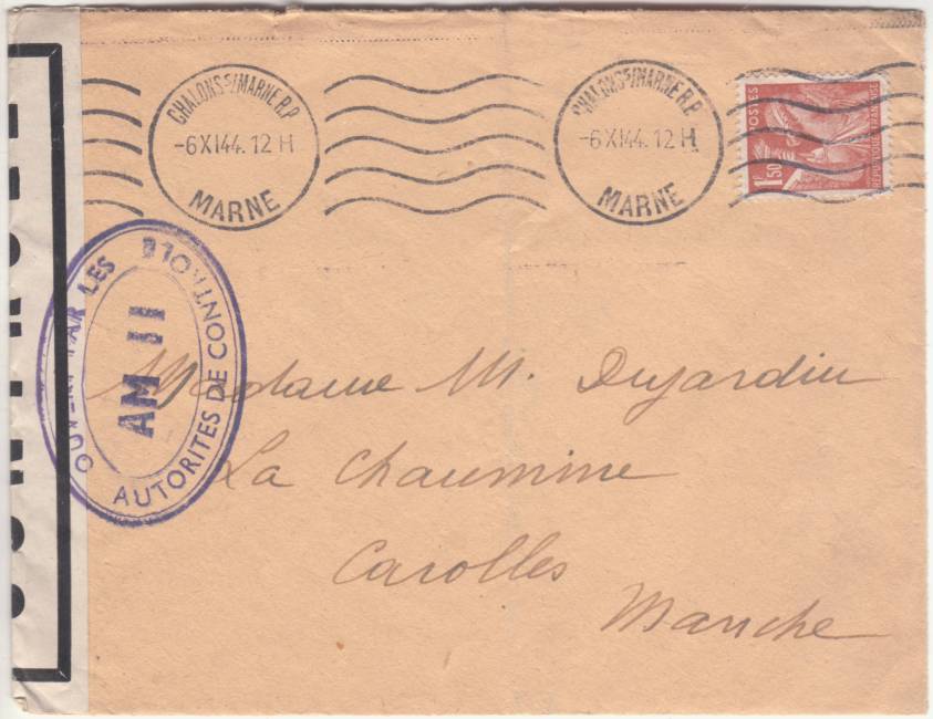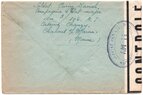 Lettre envoyée de Port-en-Bessin (Calvados) à une date difficilement lisible (peut-être 5 juin 1944), revêtue d'une double marque de contrôle britannique et française. La marque française est composée d'une bande de contrôle, d'un cachet rectangulaire 002 et de la marque ovale de la commission de Caen C-A.