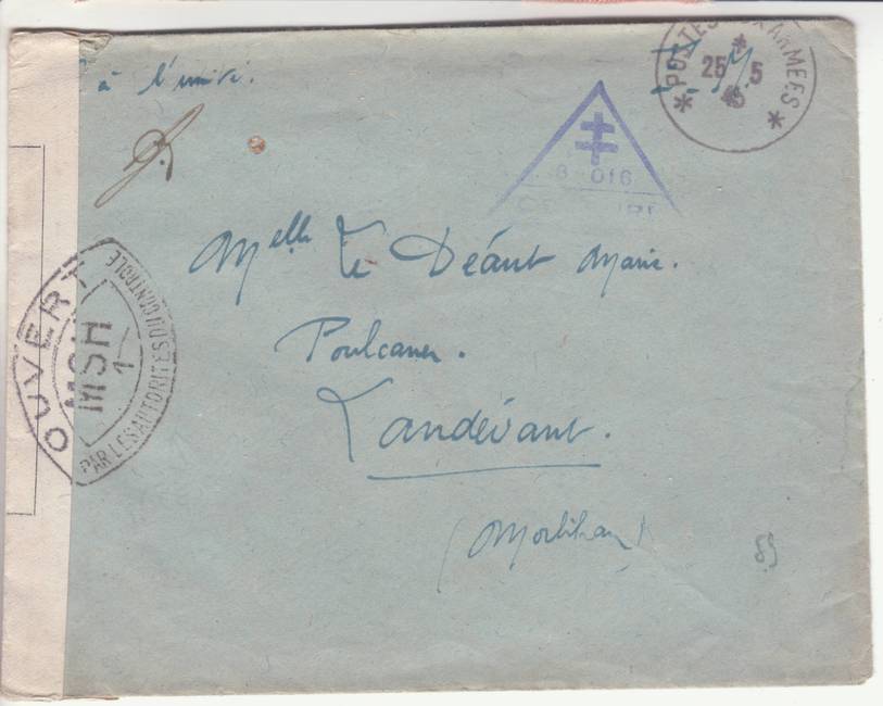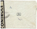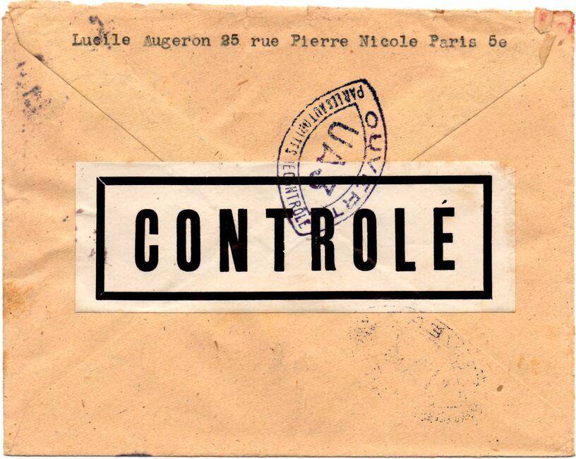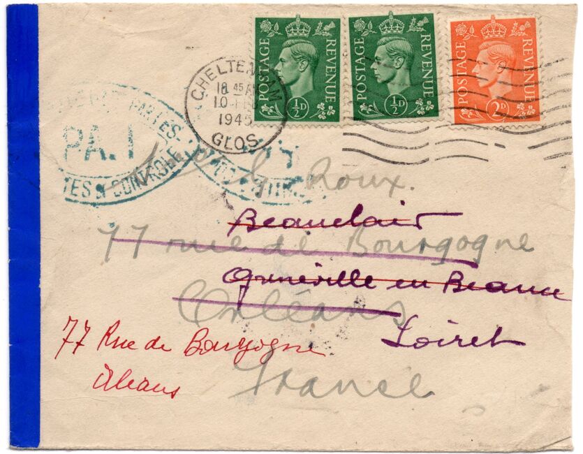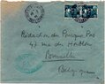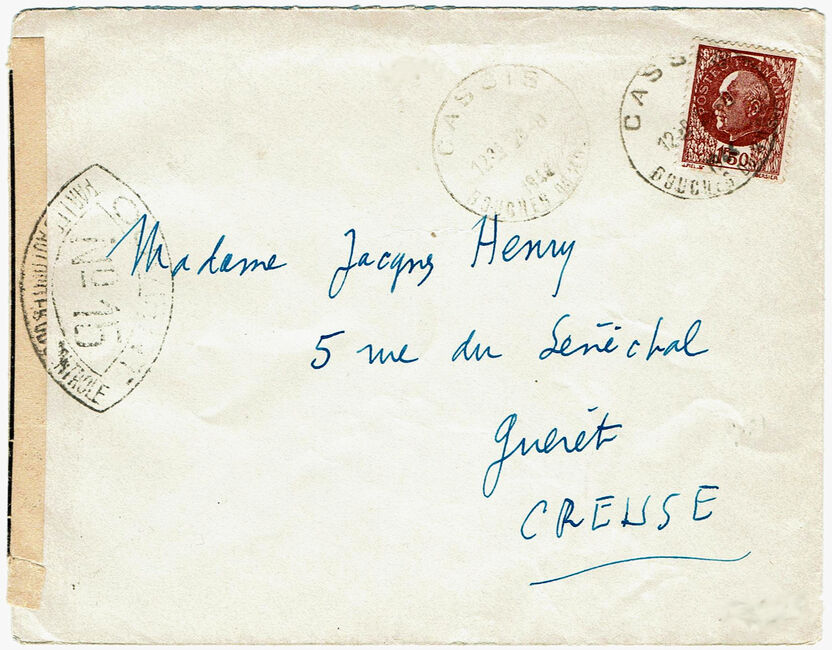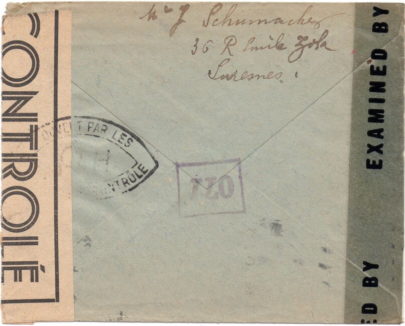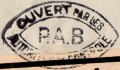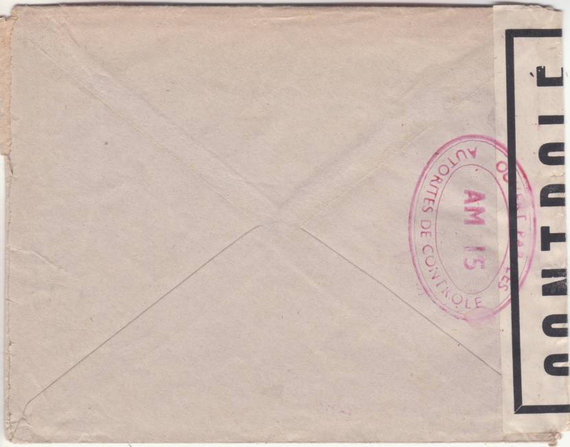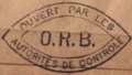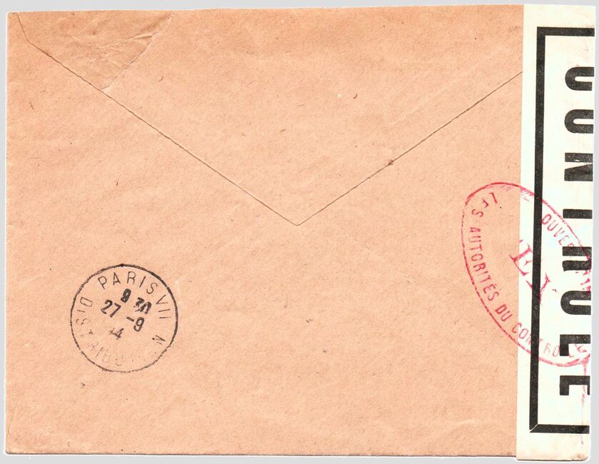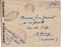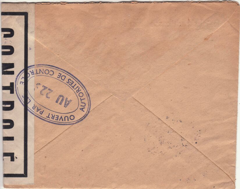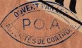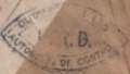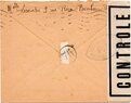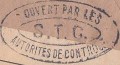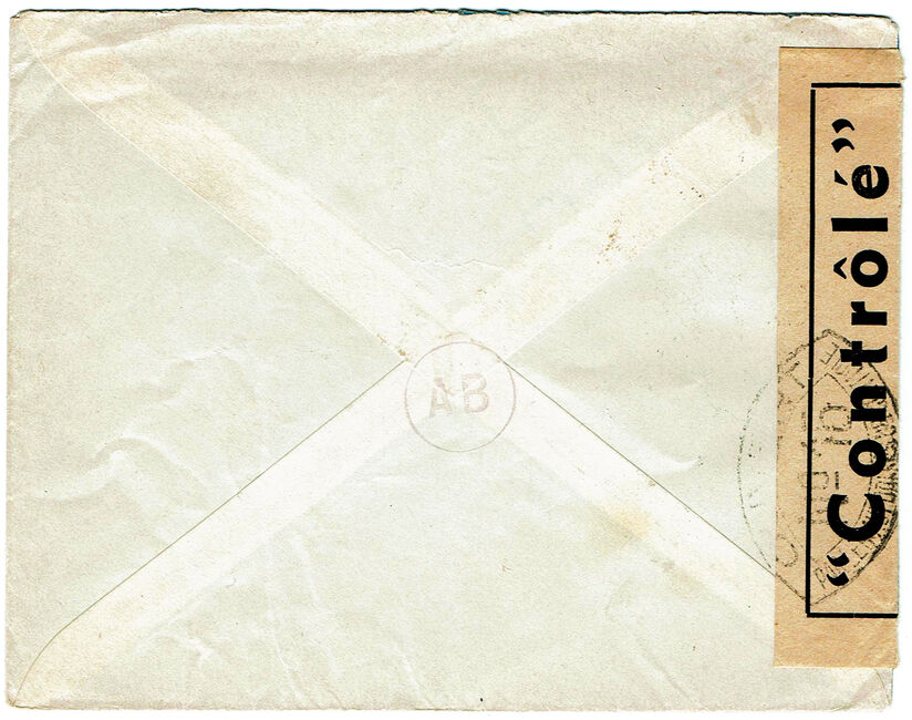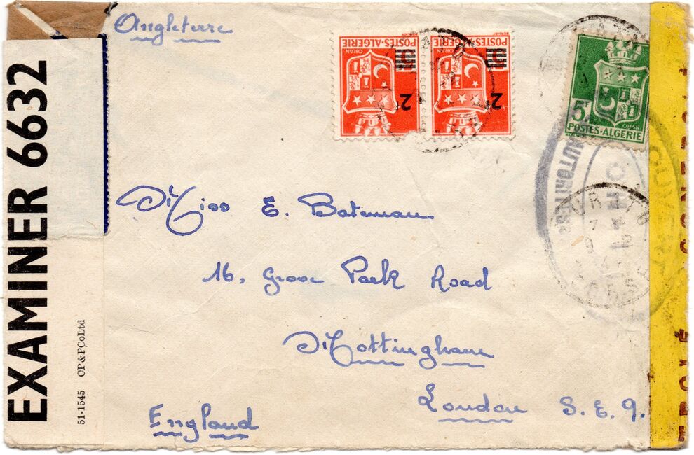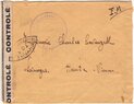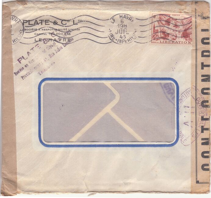 Lettre envoyée de Port-en-Bessin (Calvados) à une date difficilement lisible (peut-être 5 juin 1944), revêtue d'une double marque de contrôle britannique et française. La marque française est composée d'une bande de contrôle, d'un cachet rectangulaire 002 et de la marque ovale de la commission de Caen C-A.