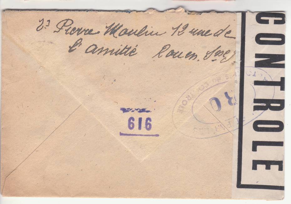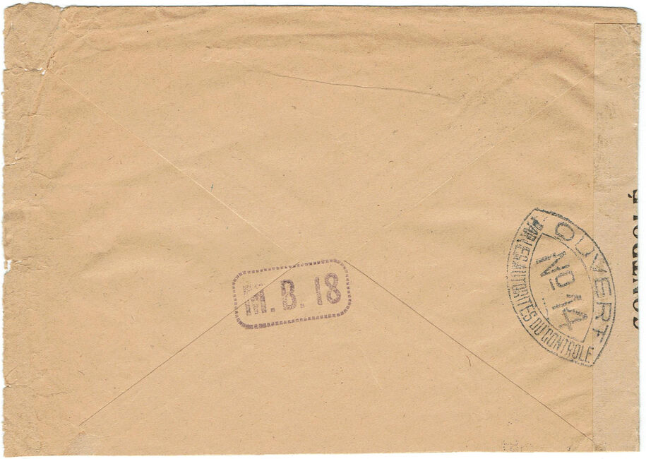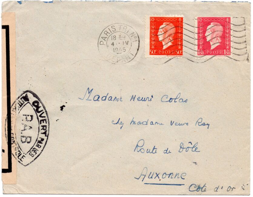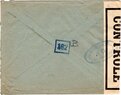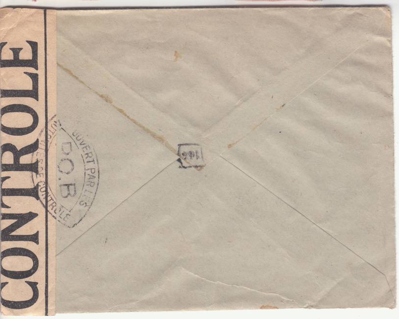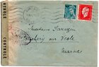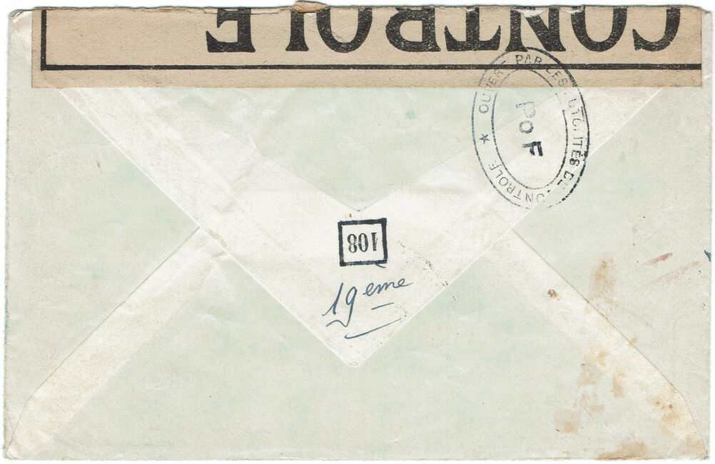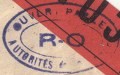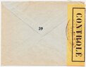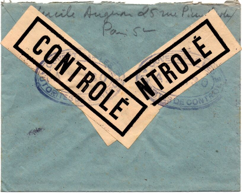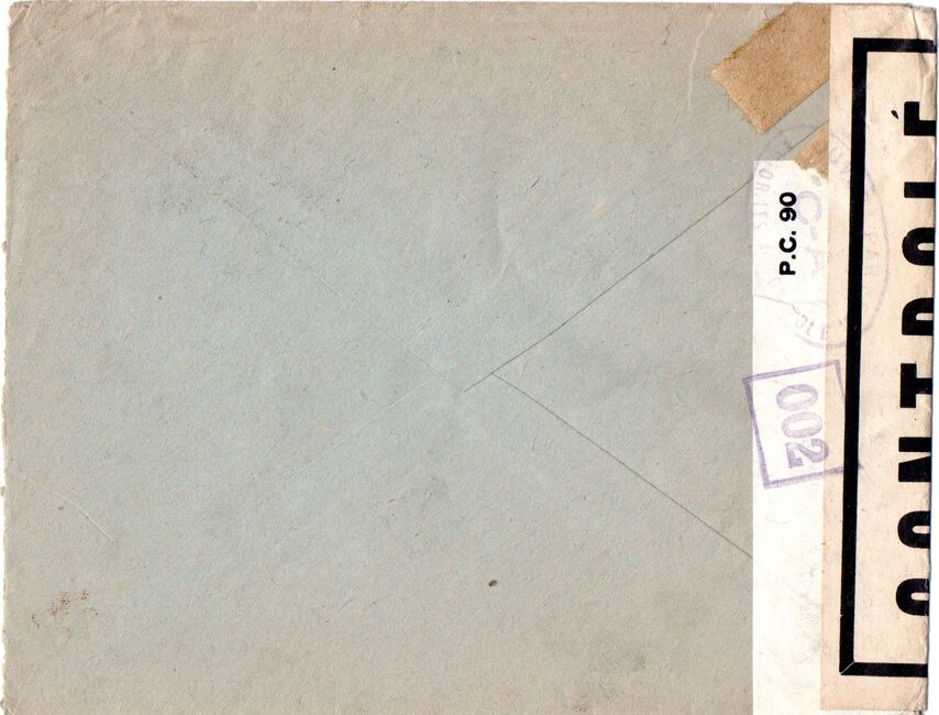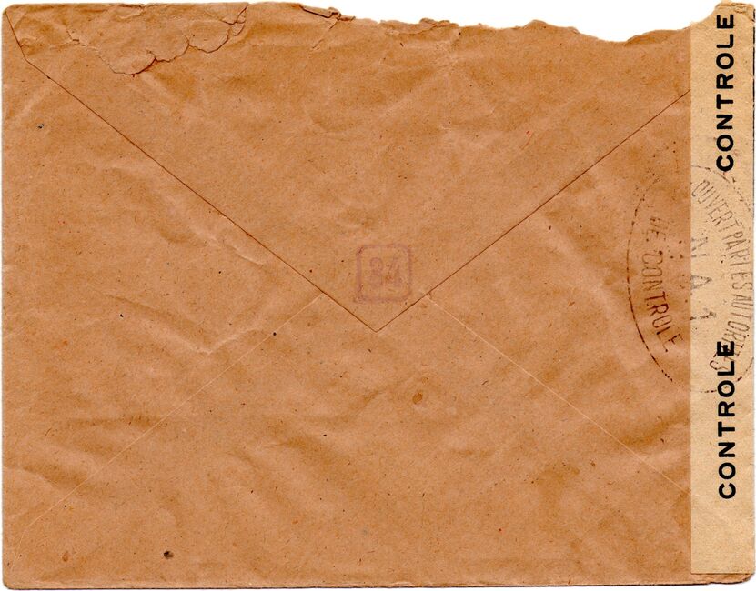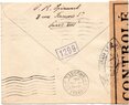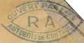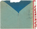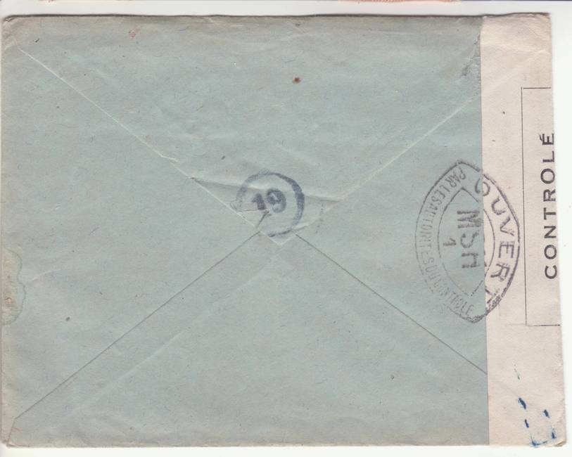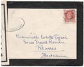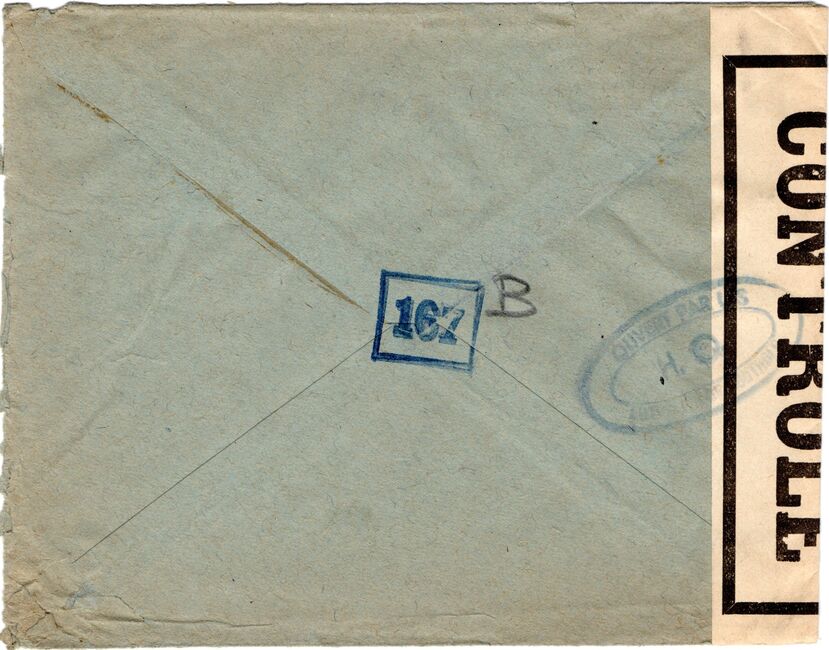 Lettre envoyée de Port-en-Bessin (Calvados) à une date difficilement lisible (peut-être 5 juin 1944), revêtue d'une double marque de contrôle britannique et française. La marque française est composée d'une bande de contrôle, d'un cachet rectangulaire 002 et de la marque ovale de la commission de Caen C-A.