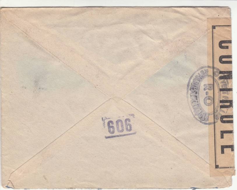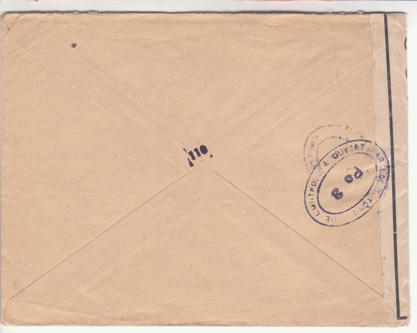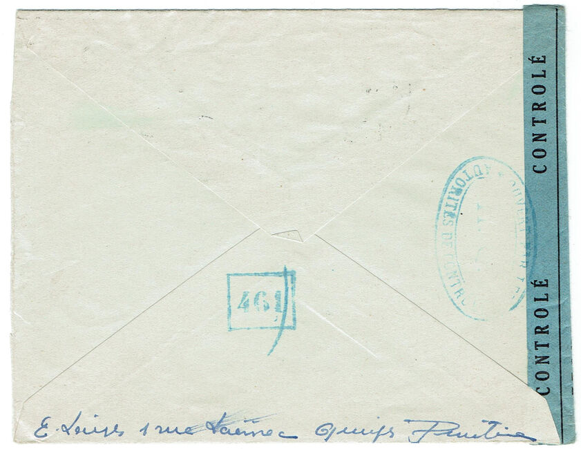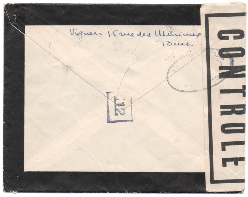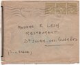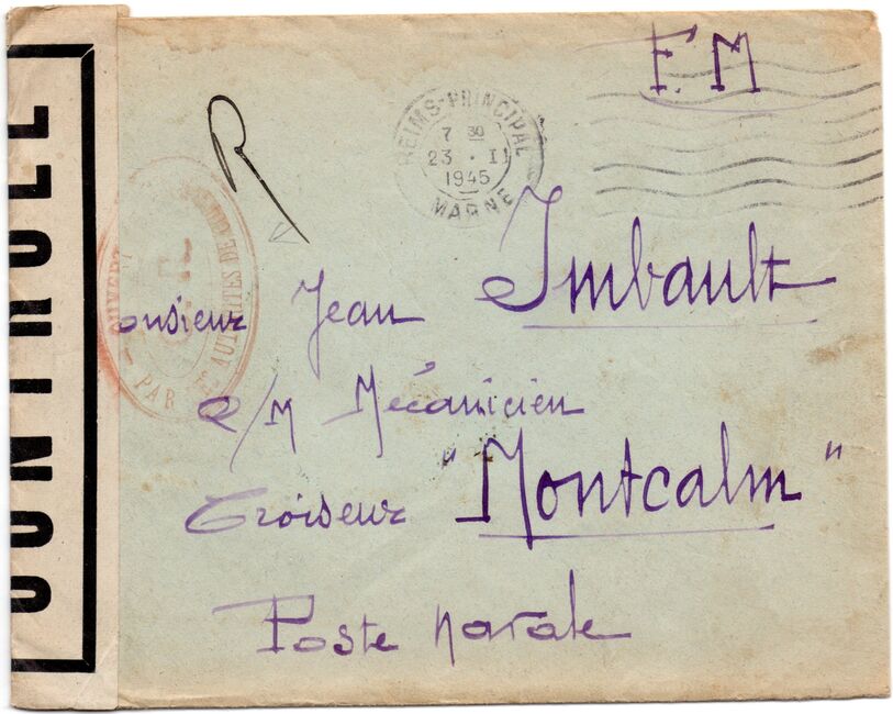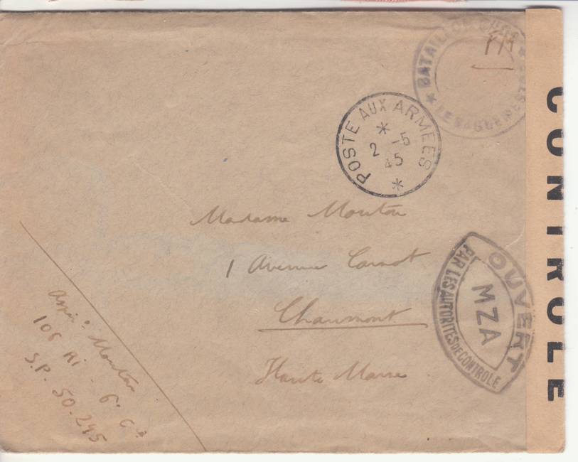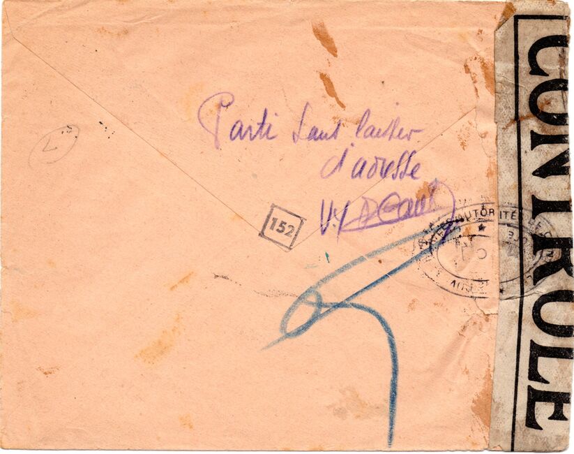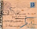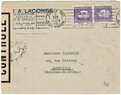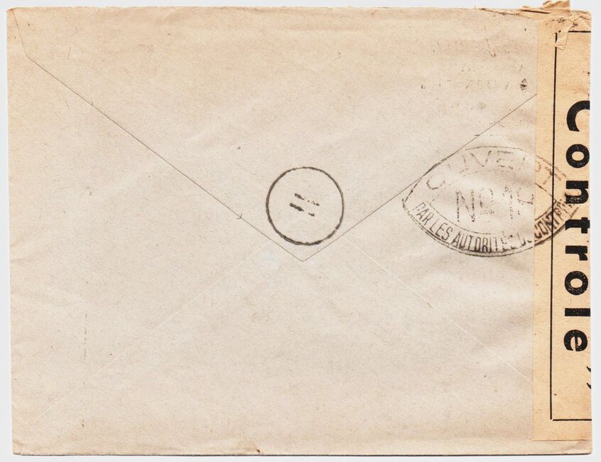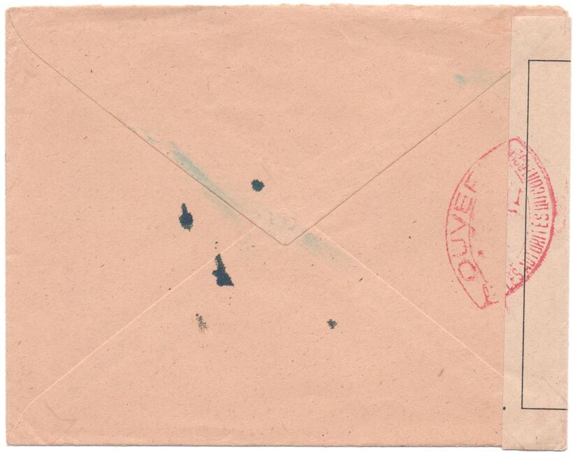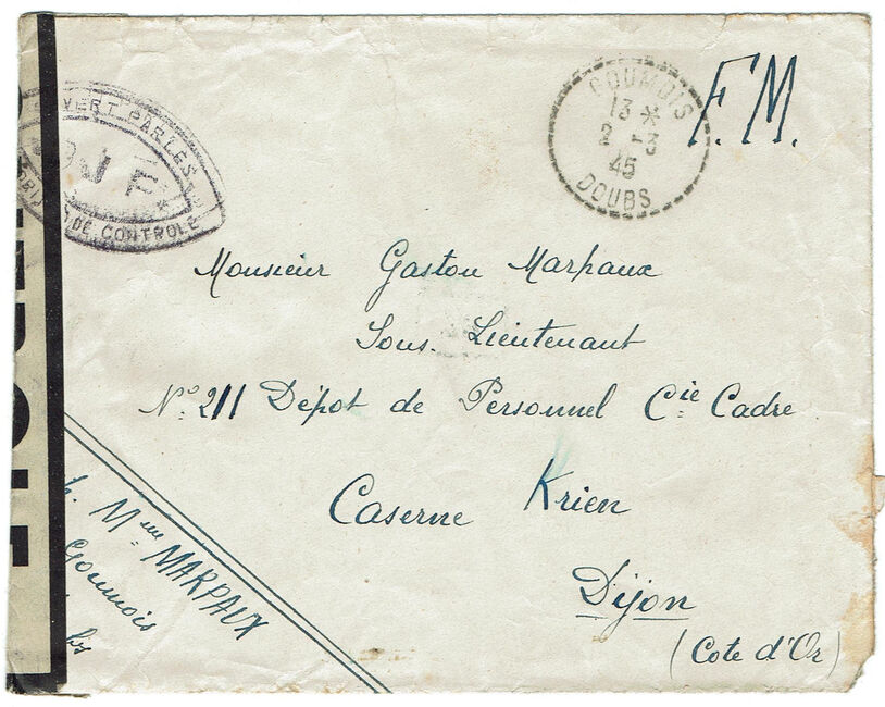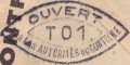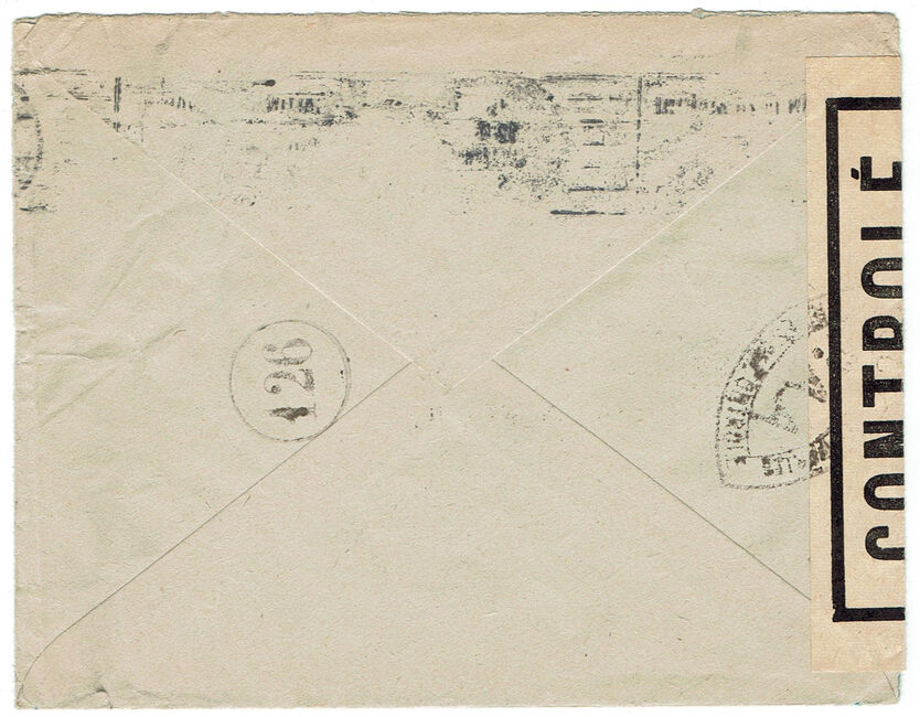 Lettre envoyée de Port-en-Bessin (Calvados) à une date difficilement lisible (peut-être 5 juin 1944), revêtue d'une double marque de contrôle britannique et française. La marque française est composée d'une bande de contrôle, d'un cachet rectangulaire 002 et de la marque ovale de la commission de Caen C-A.