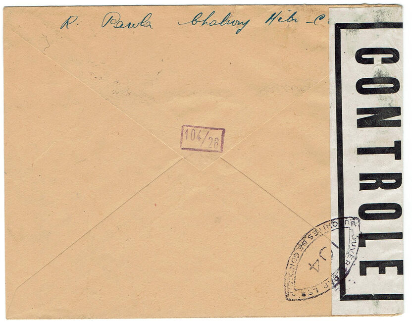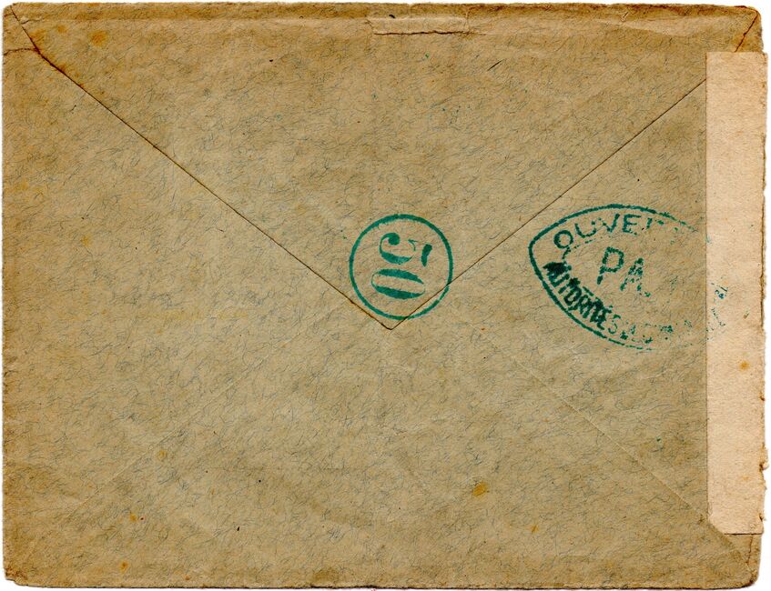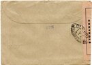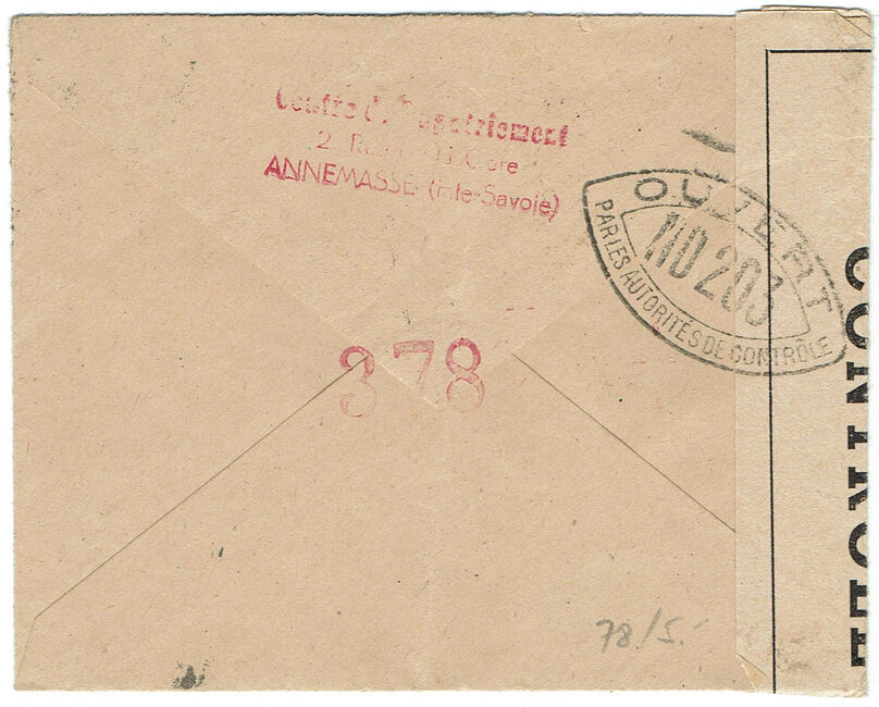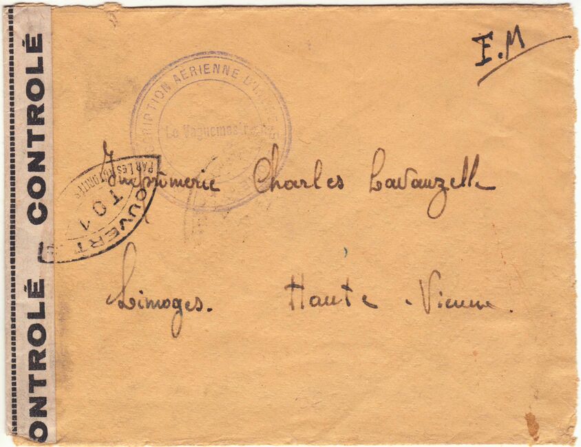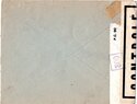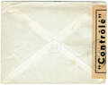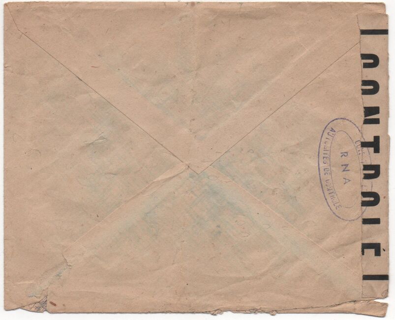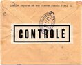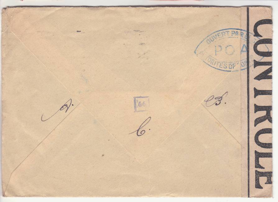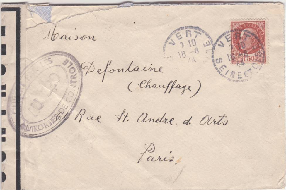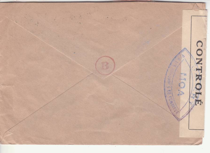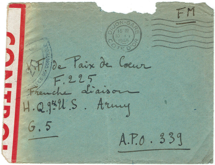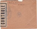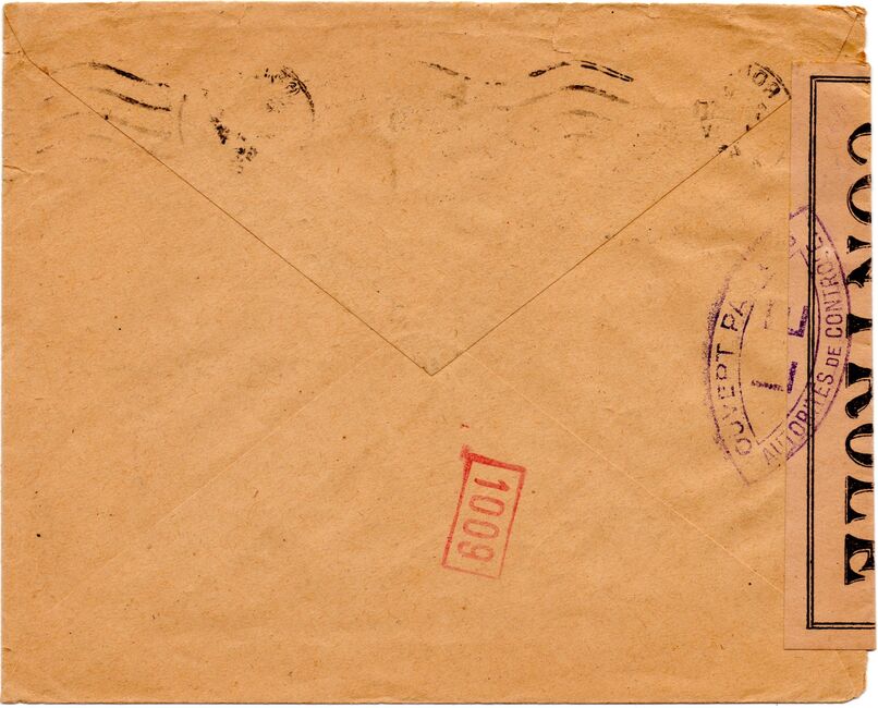 Lettre envoyée de Port-en-Bessin (Calvados) à une date difficilement lisible (peut-être 5 juin 1944), revêtue d'une double marque de contrôle britannique et française. La marque française est composée d'une bande de contrôle, d'un cachet rectangulaire 002 et de la marque ovale de la commission de Caen C-A.