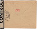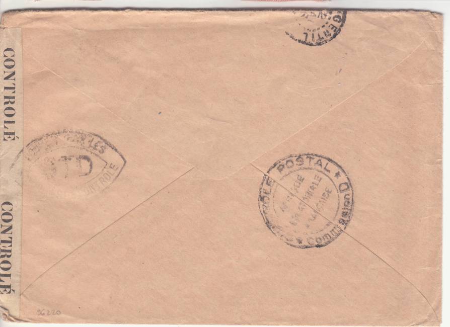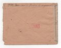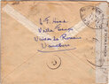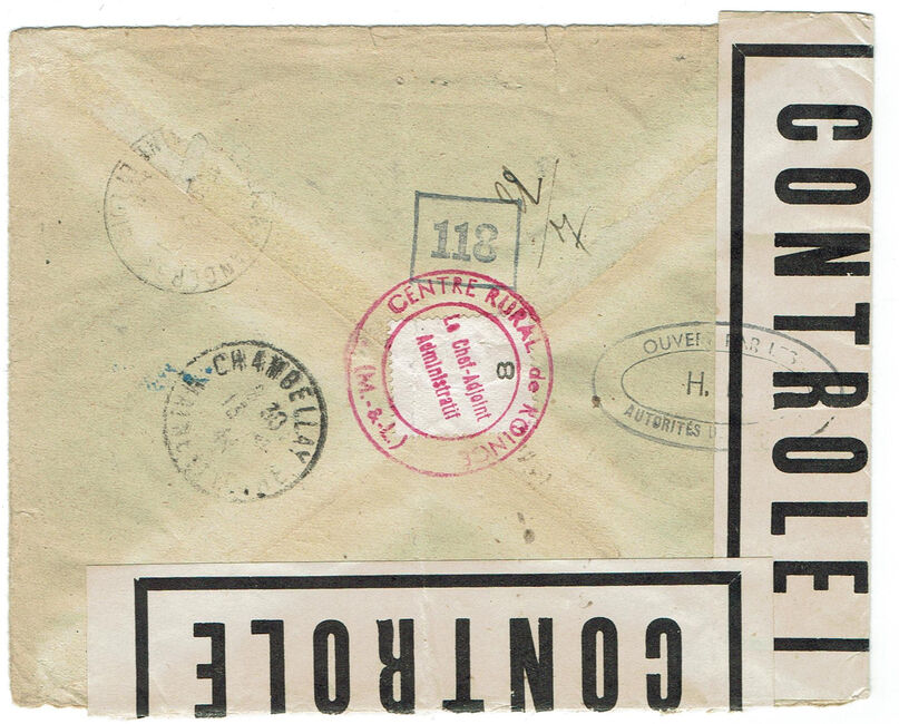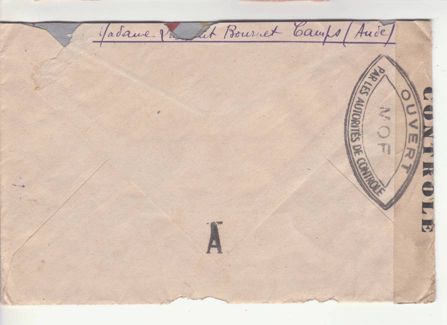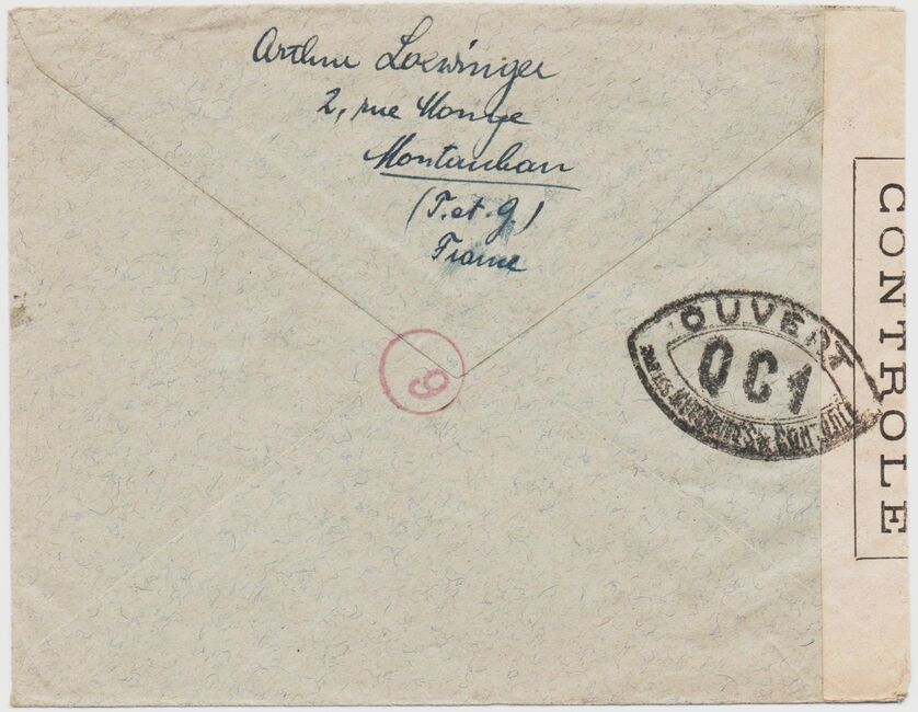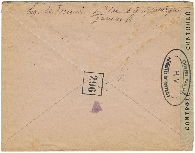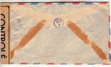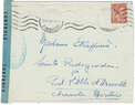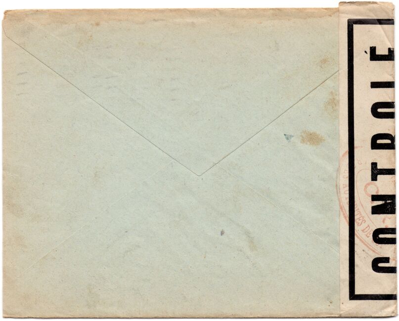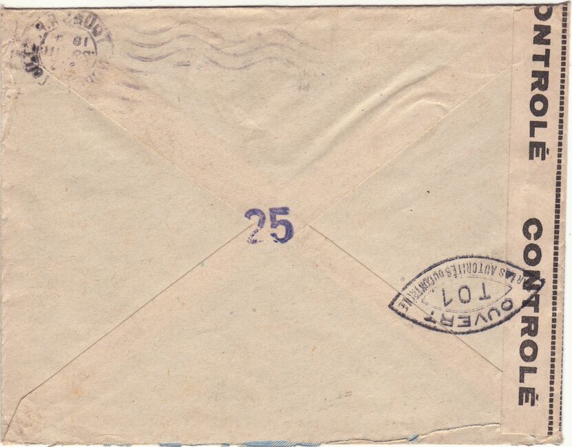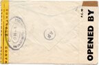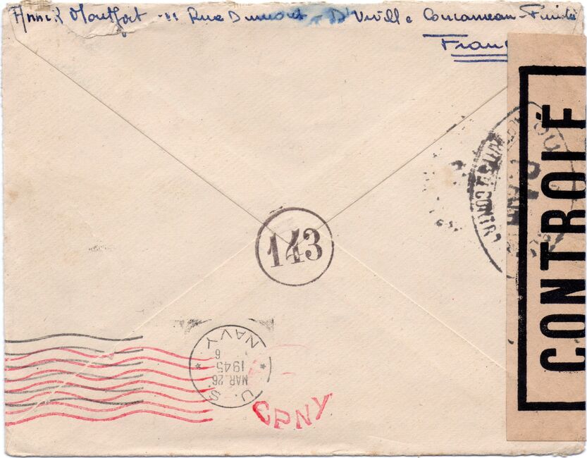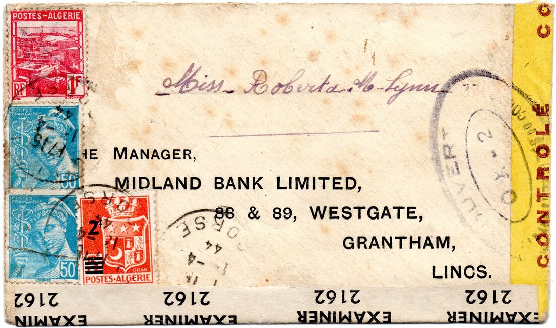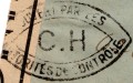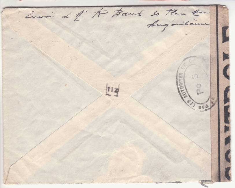 Lettre envoyée de Port-en-Bessin (Calvados) à une date difficilement lisible (peut-être 5 juin 1944), revêtue d'une double marque de contrôle britannique et française. La marque française est composée d'une bande de contrôle, d'un cachet rectangulaire 002 et de la marque ovale de la commission de Caen C-A.