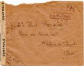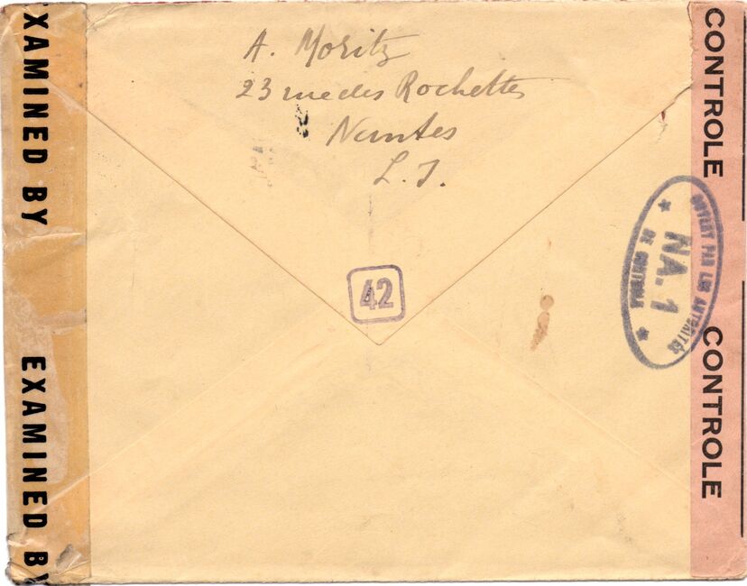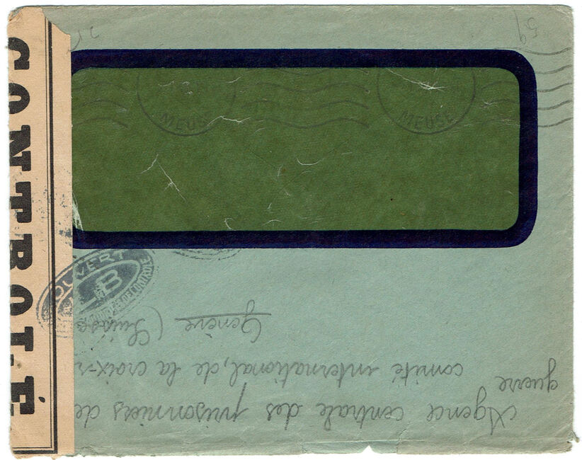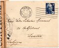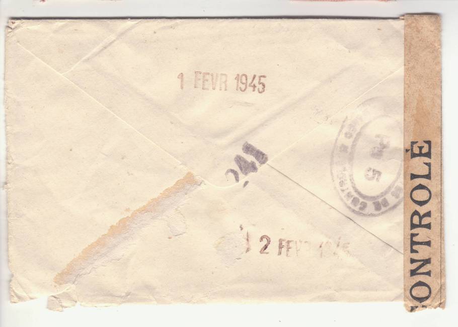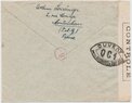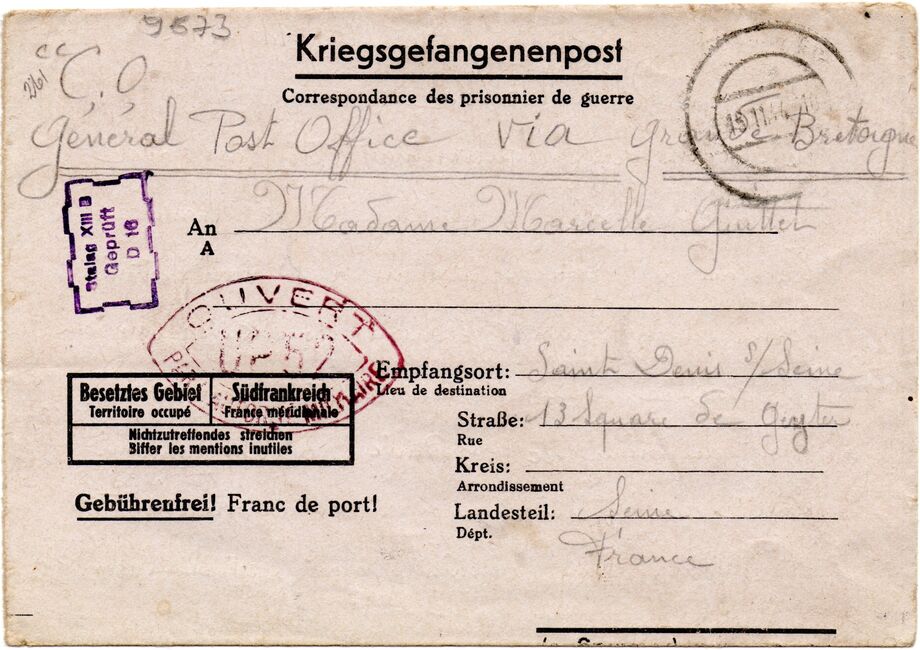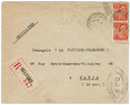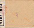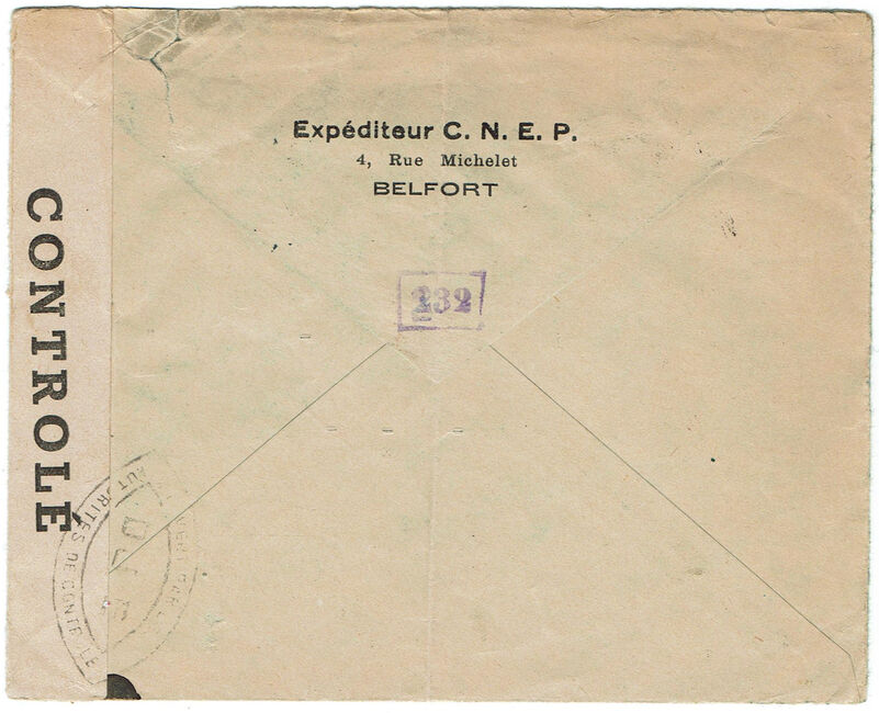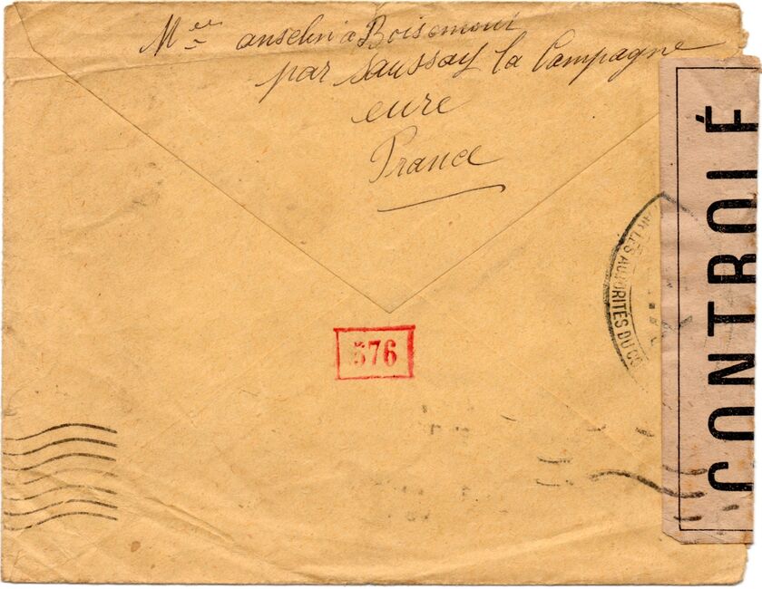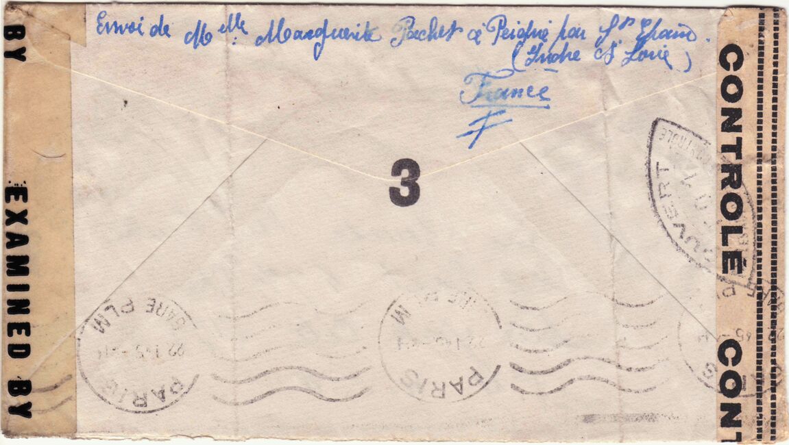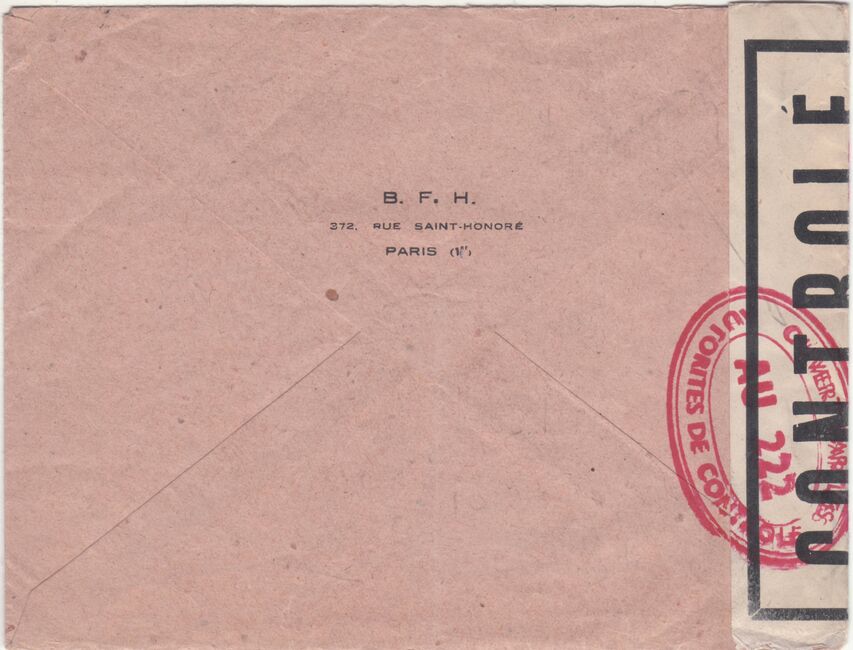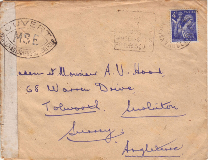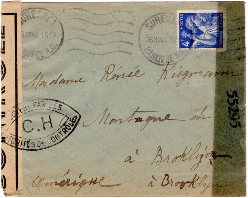 Lettre envoyée de Port-en-Bessin (Calvados) à une date difficilement lisible (peut-être 5 juin 1944), revêtue d'une double marque de contrôle britannique et française. La marque française est composée d'une bande de contrôle, d'un cachet rectangulaire 002 et de la marque ovale de la commission de Caen C-A.