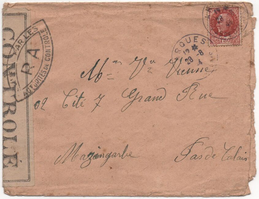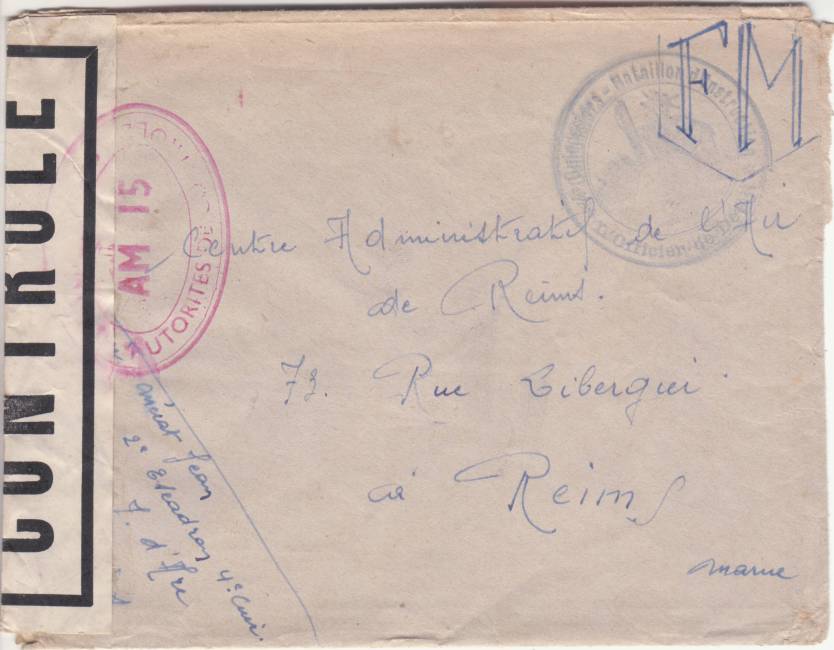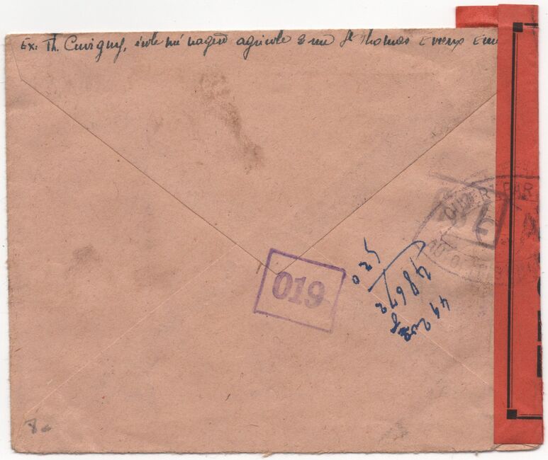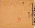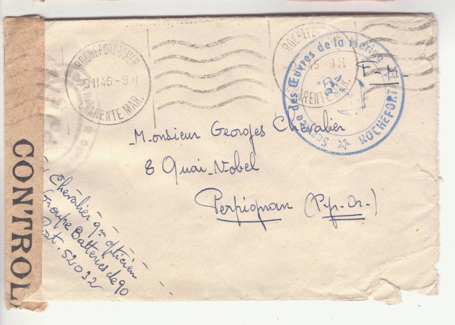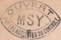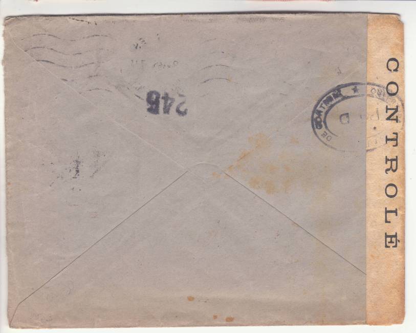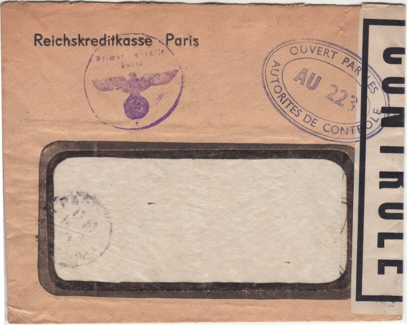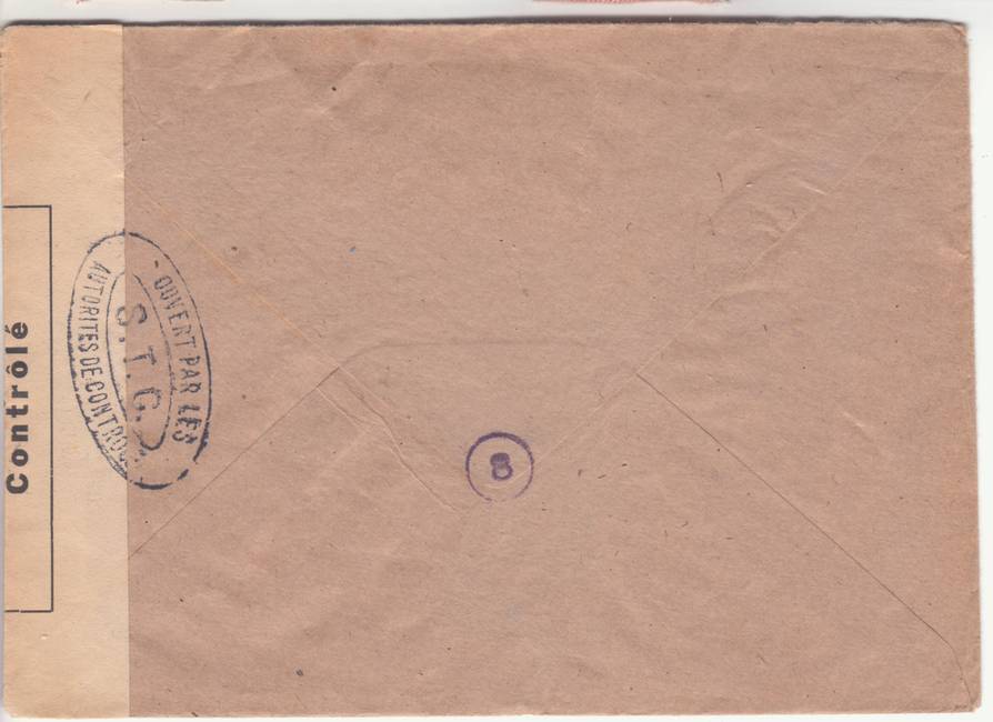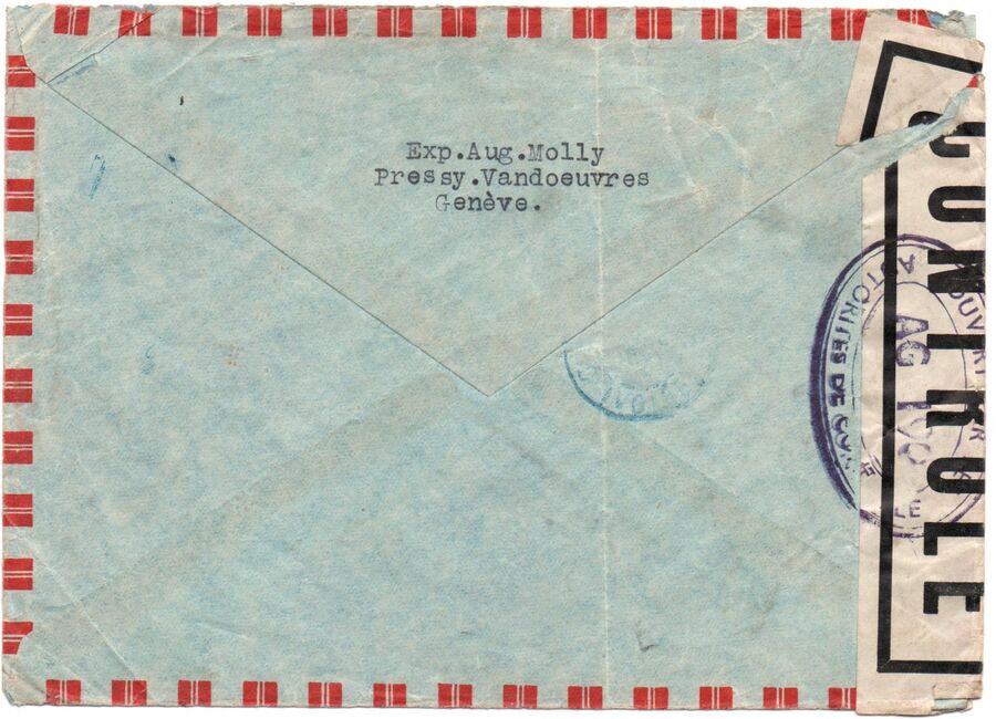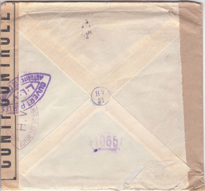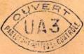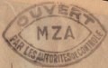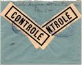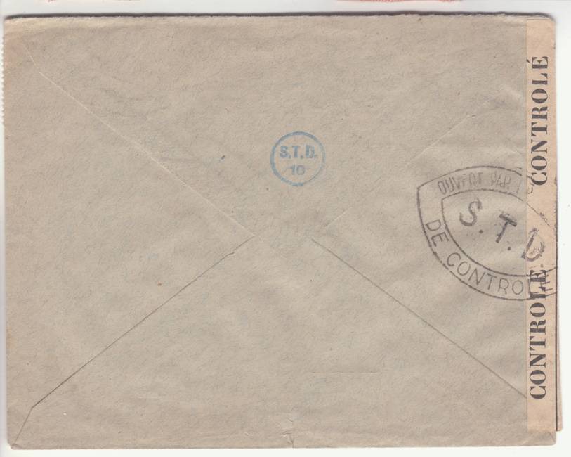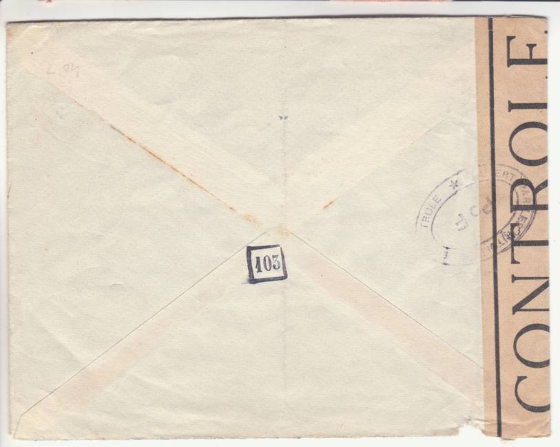 Lettre envoyée de Port-en-Bessin (Calvados) à une date difficilement lisible (peut-être 5 juin 1944), revêtue d'une double marque de contrôle britannique et française. La marque française est composée d'une bande de contrôle, d'un cachet rectangulaire 002 et de la marque ovale de la commission de Caen C-A.