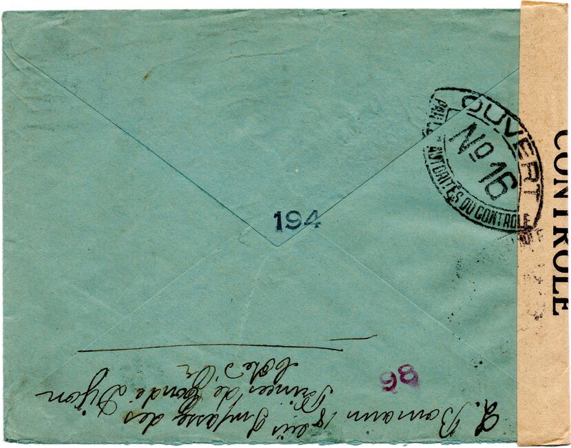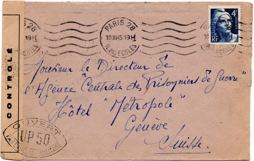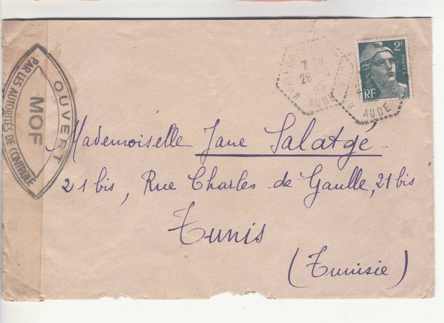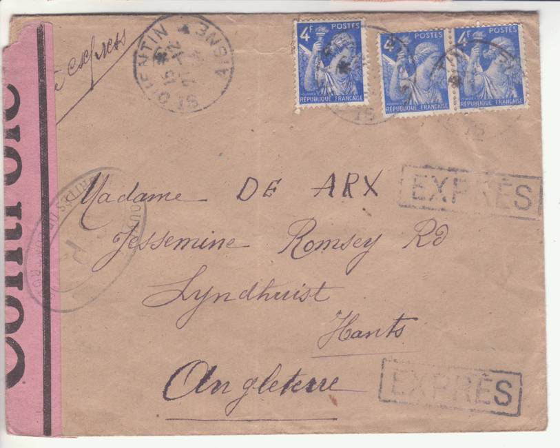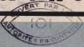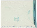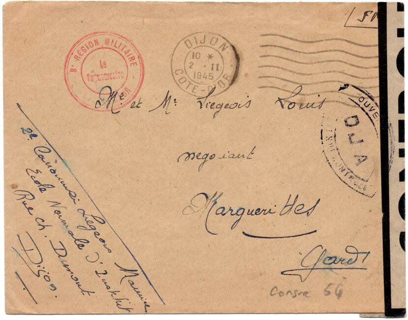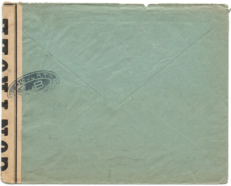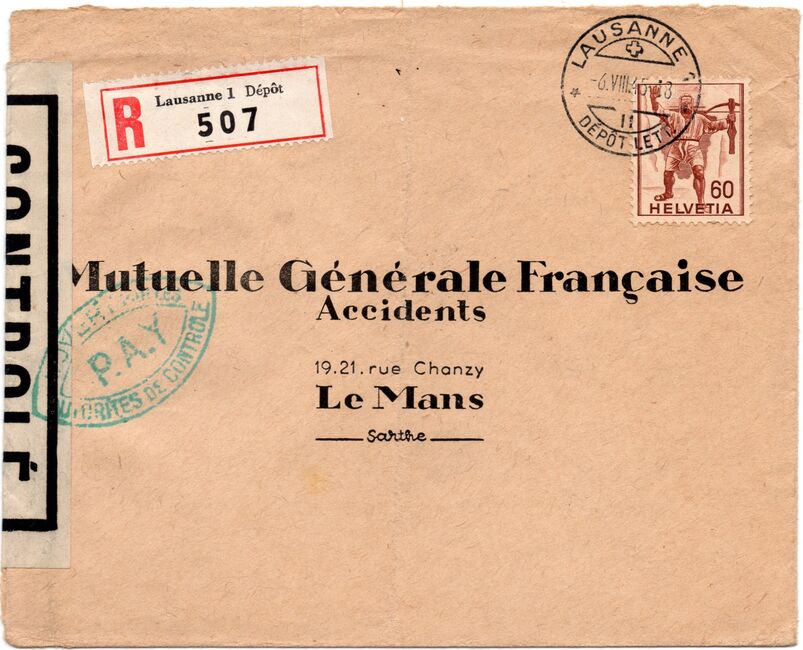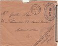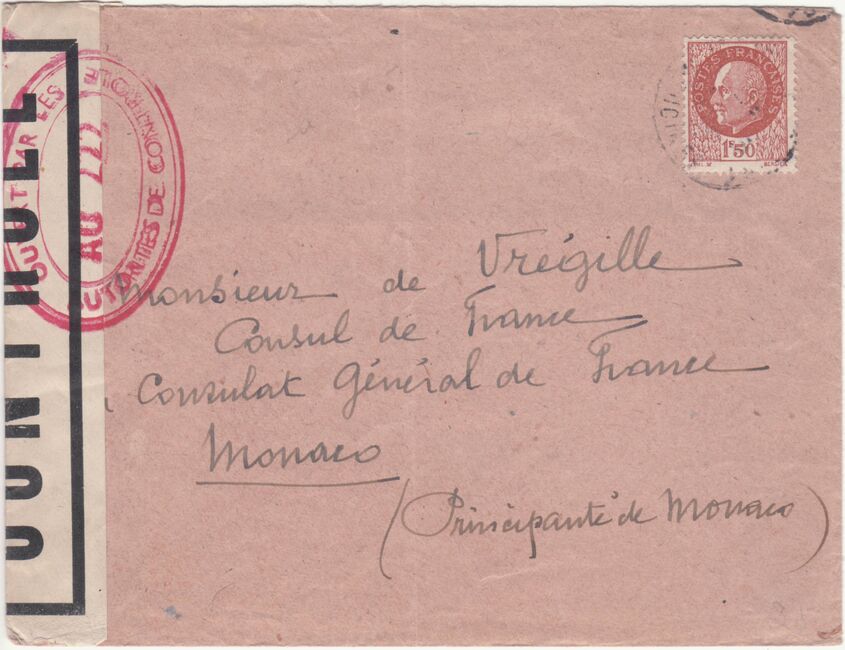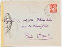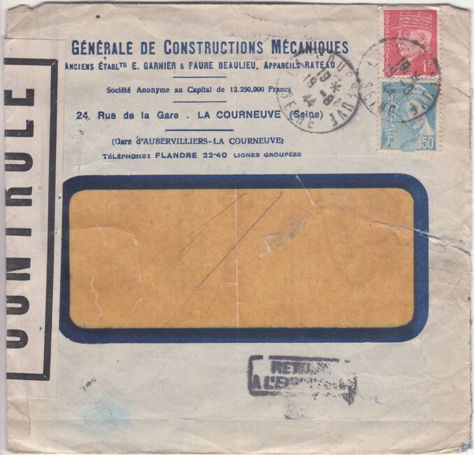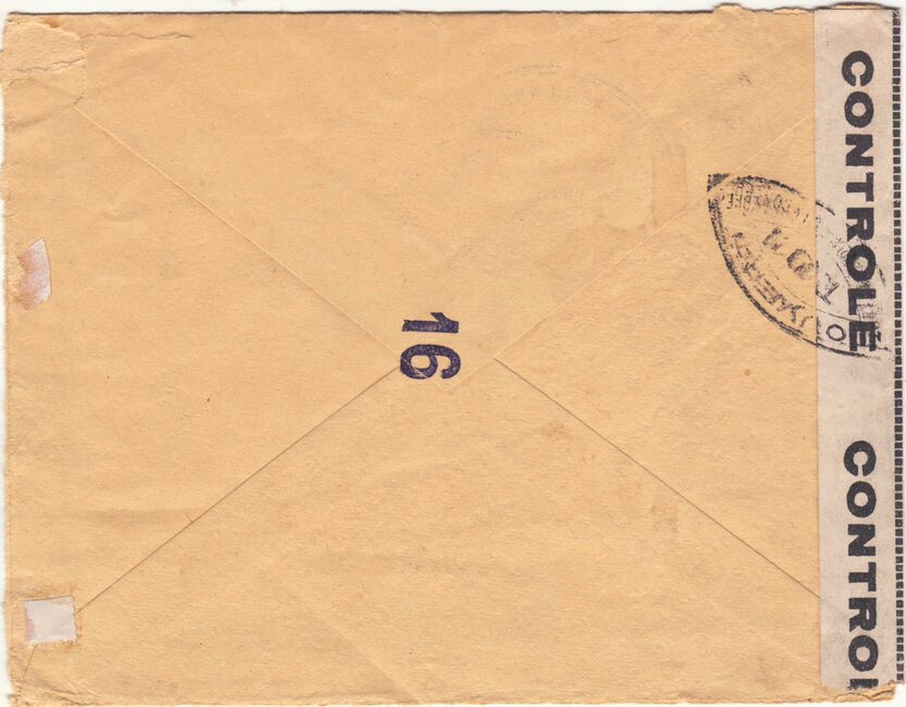 Lettre envoyée de Port-en-Bessin (Calvados) à une date difficilement lisible (peut-être 5 juin 1944), revêtue d'une double marque de contrôle britannique et française. La marque française est composée d'une bande de contrôle, d'un cachet rectangulaire 002 et de la marque ovale de la commission de Caen C-A.