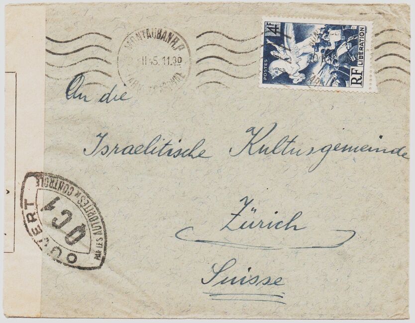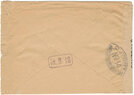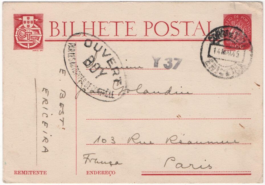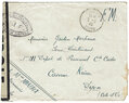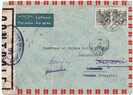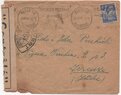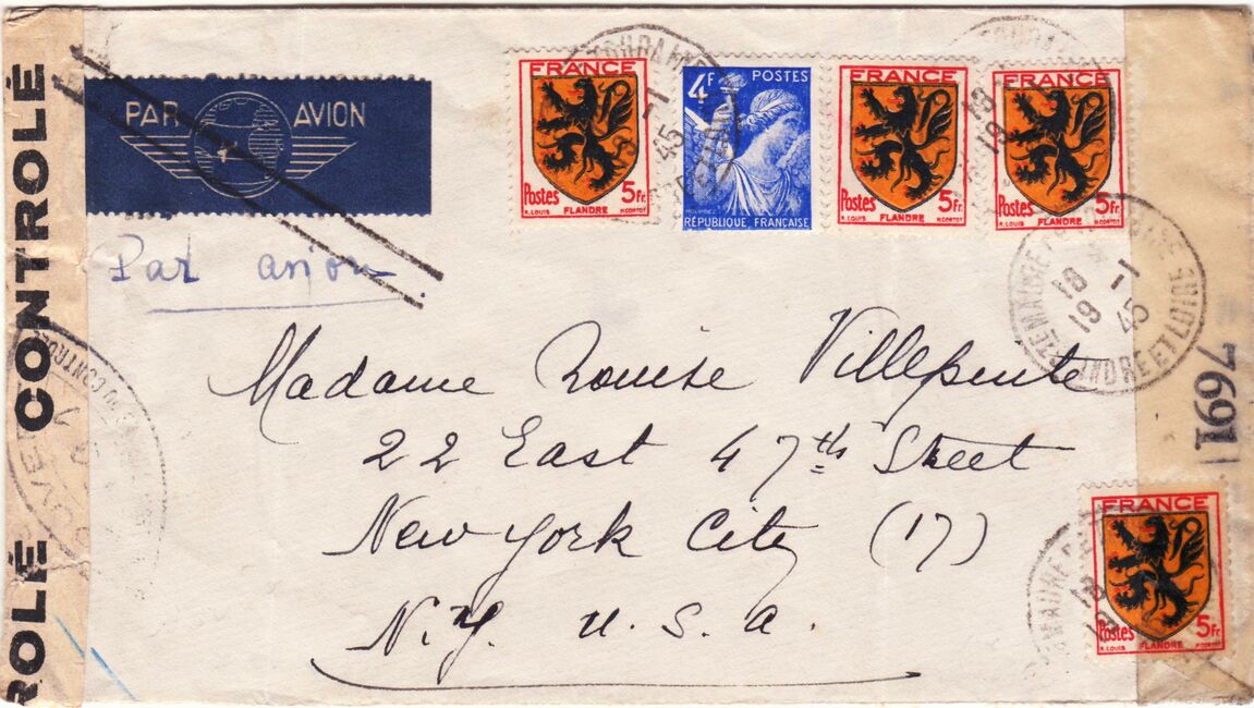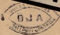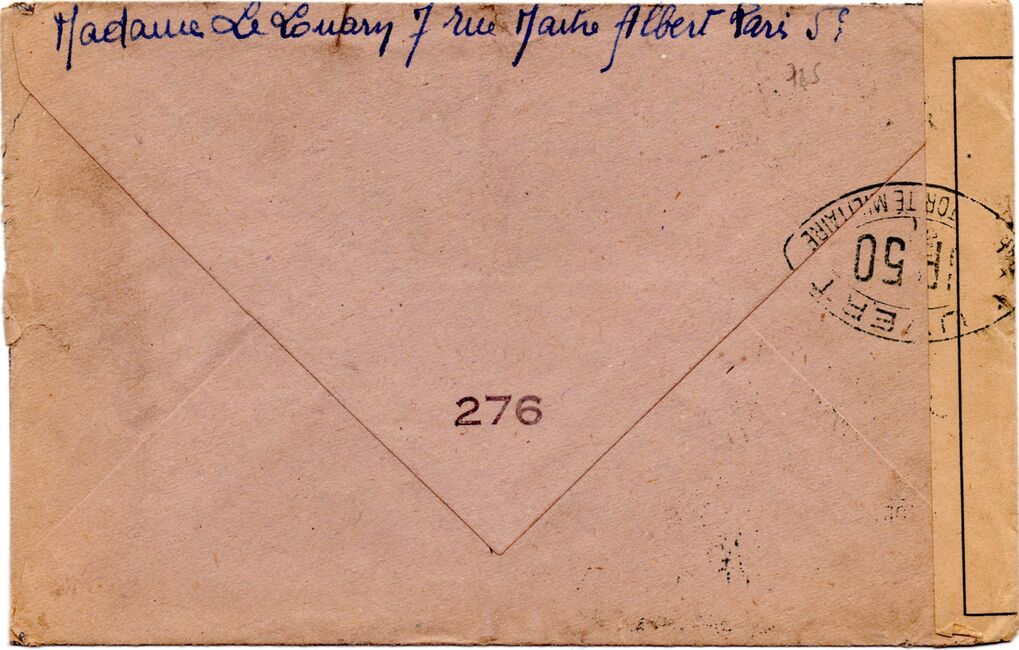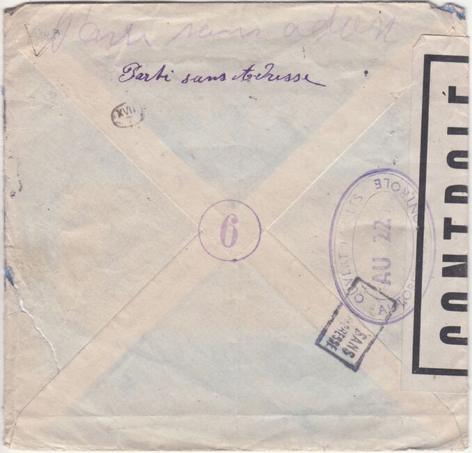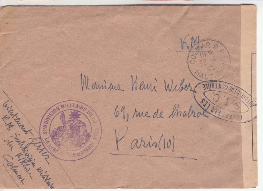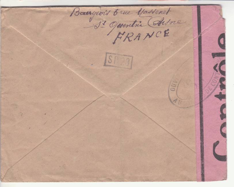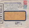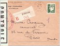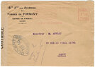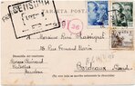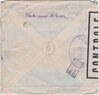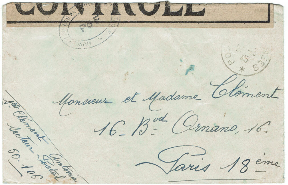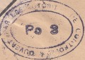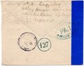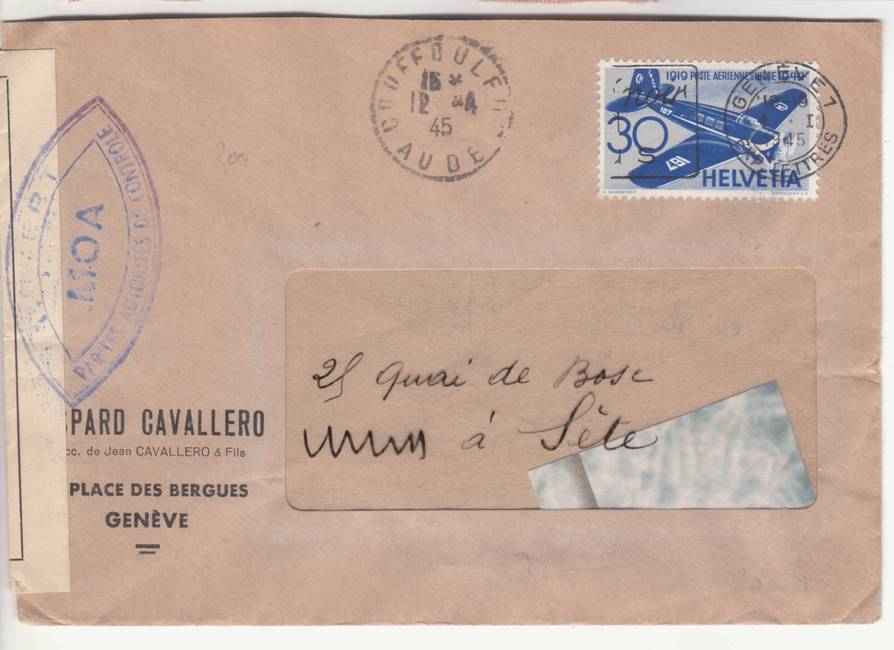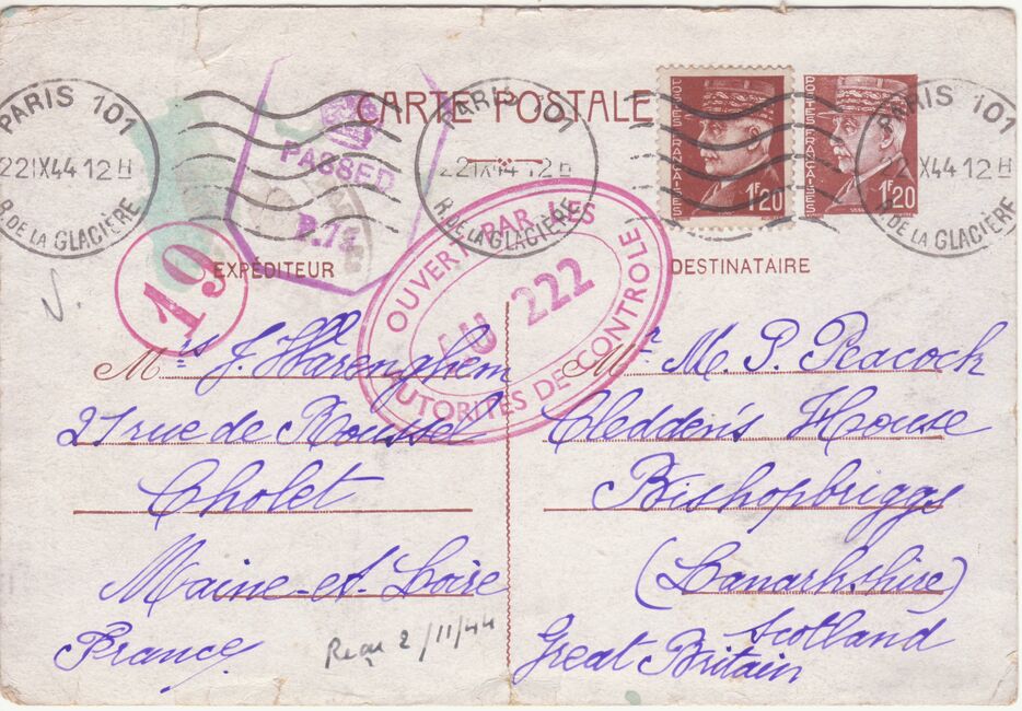 Lettre envoyée de Port-en-Bessin (Calvados) à une date difficilement lisible (peut-être 5 juin 1944), revêtue d'une double marque de contrôle britannique et française. La marque française est composée d'une bande de contrôle, d'un cachet rectangulaire 002 et de la marque ovale de la commission de Caen C-A.