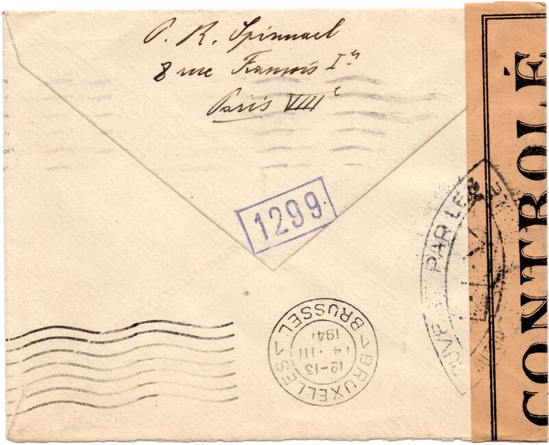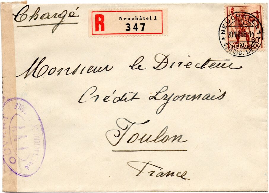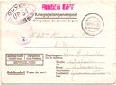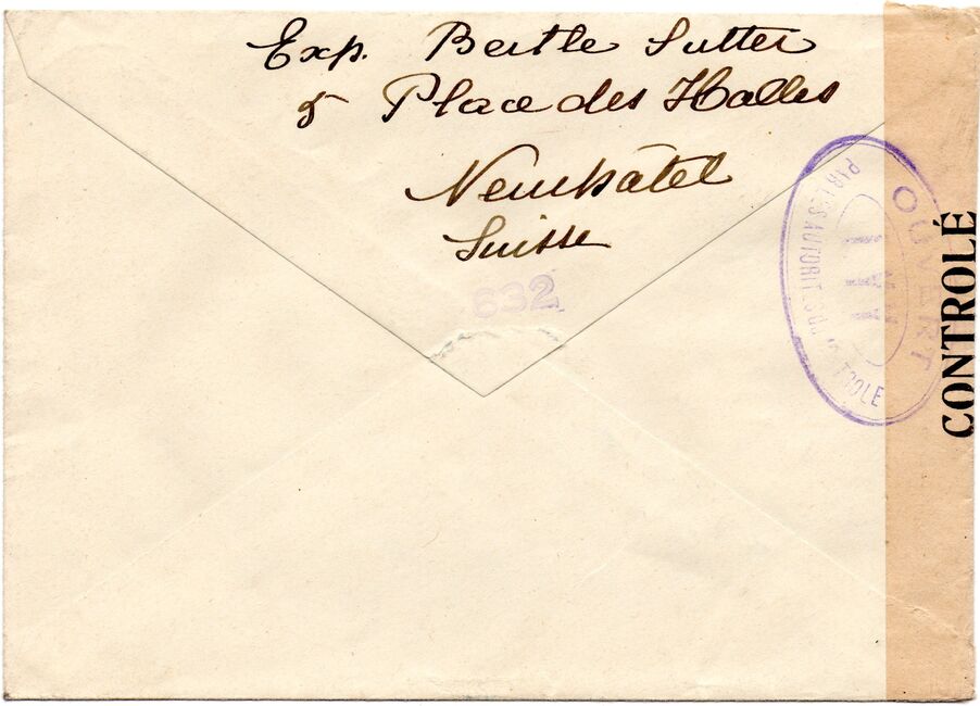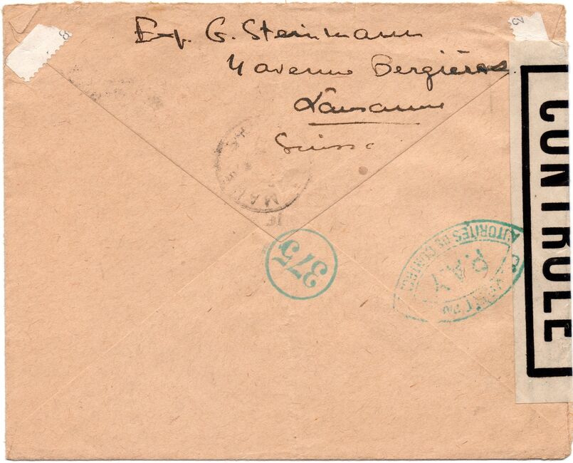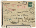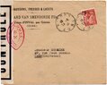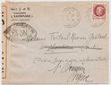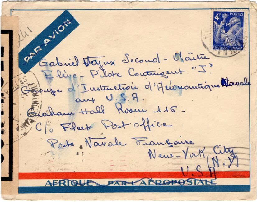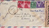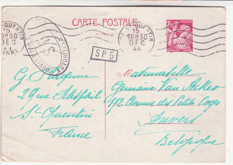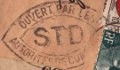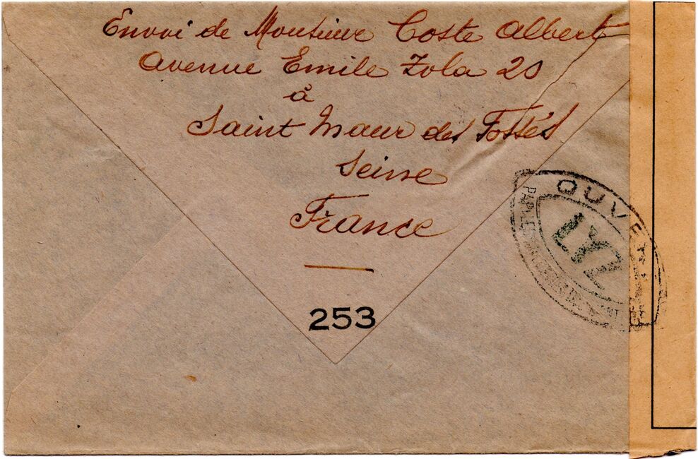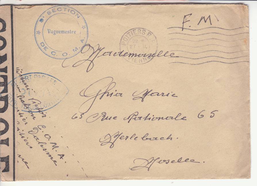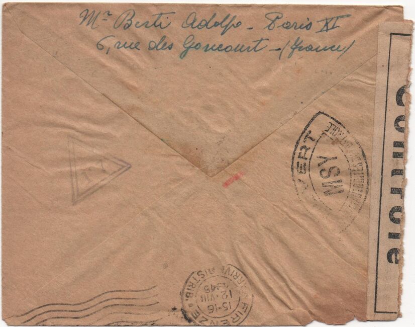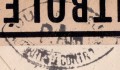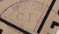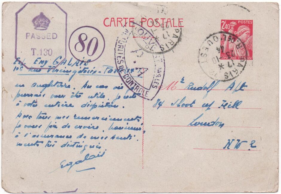 Lettre envoyée de Port-en-Bessin (Calvados) à une date difficilement lisible (peut-être 5 juin 1944), revêtue d'une double marque de contrôle britannique et française. La marque française est composée d'une bande de contrôle, d'un cachet rectangulaire 002 et de la marque ovale de la commission de Caen C-A.