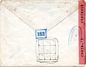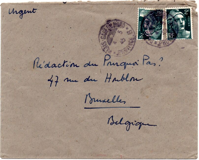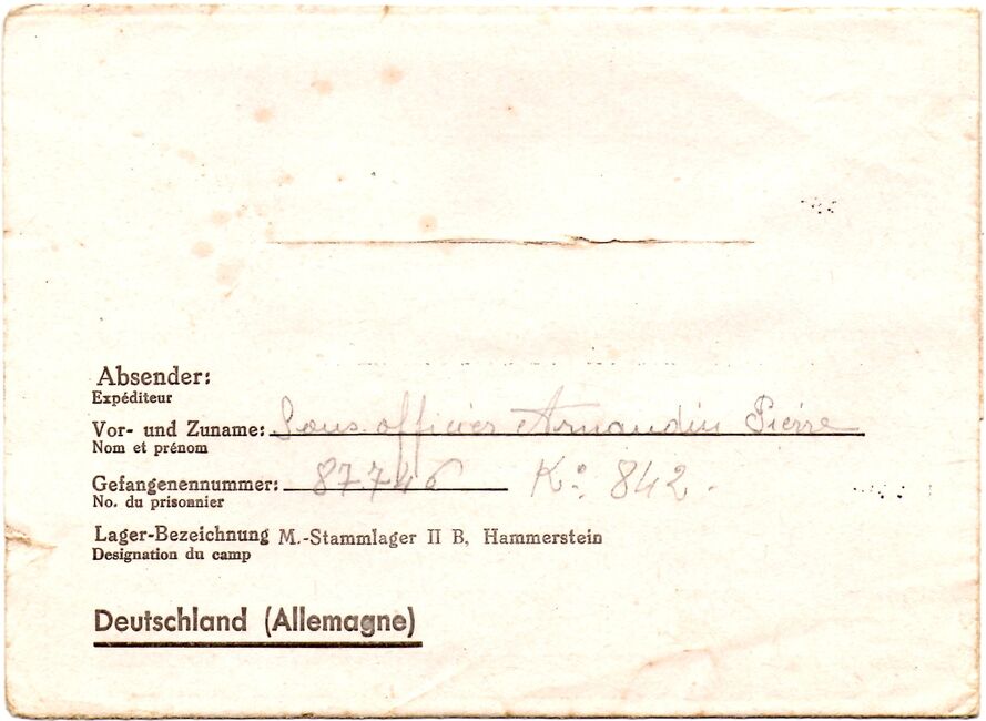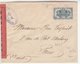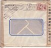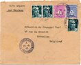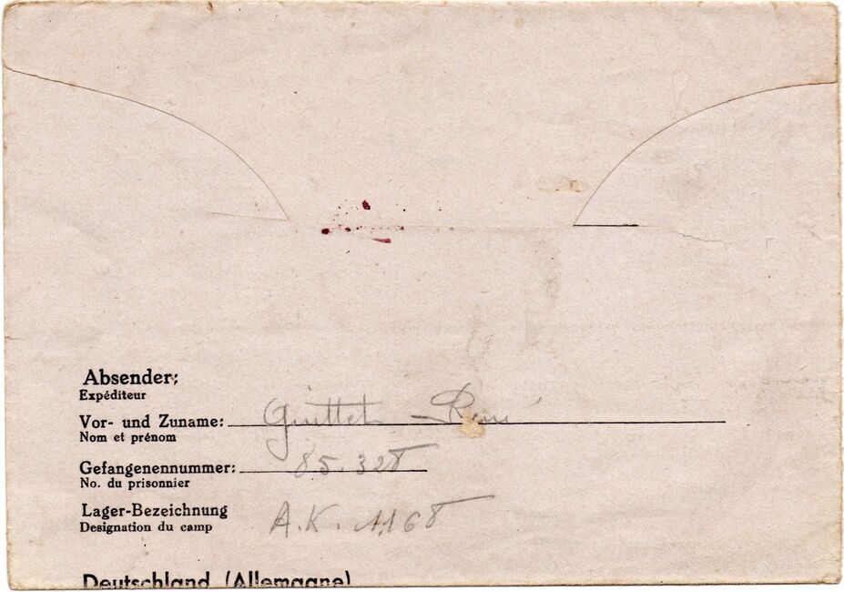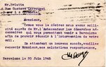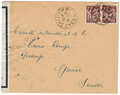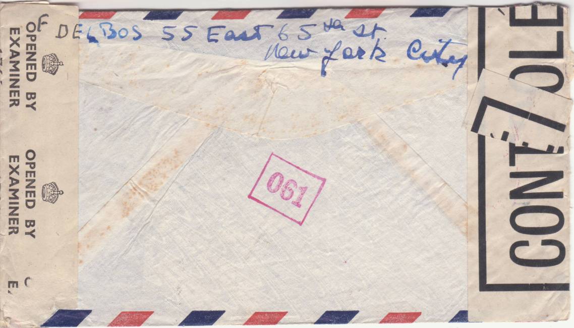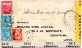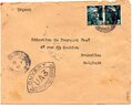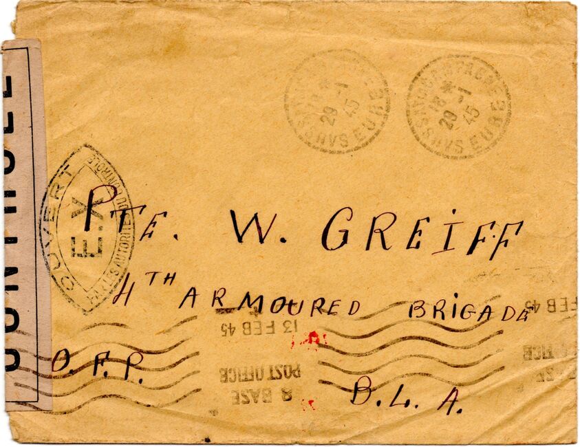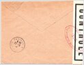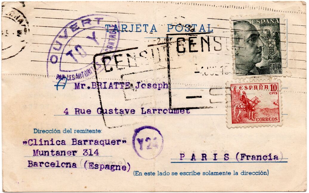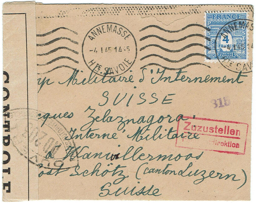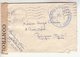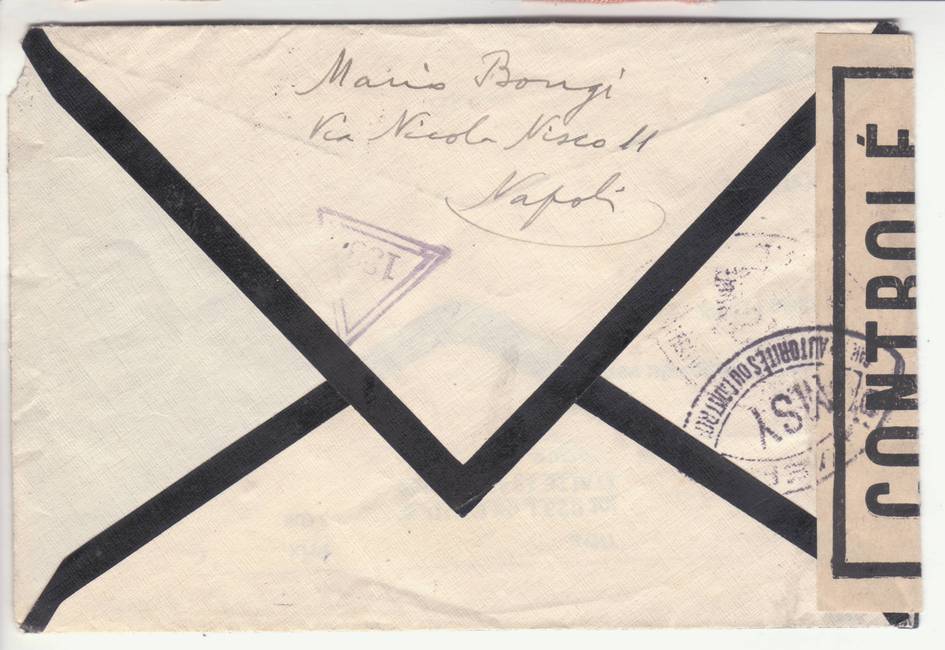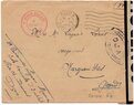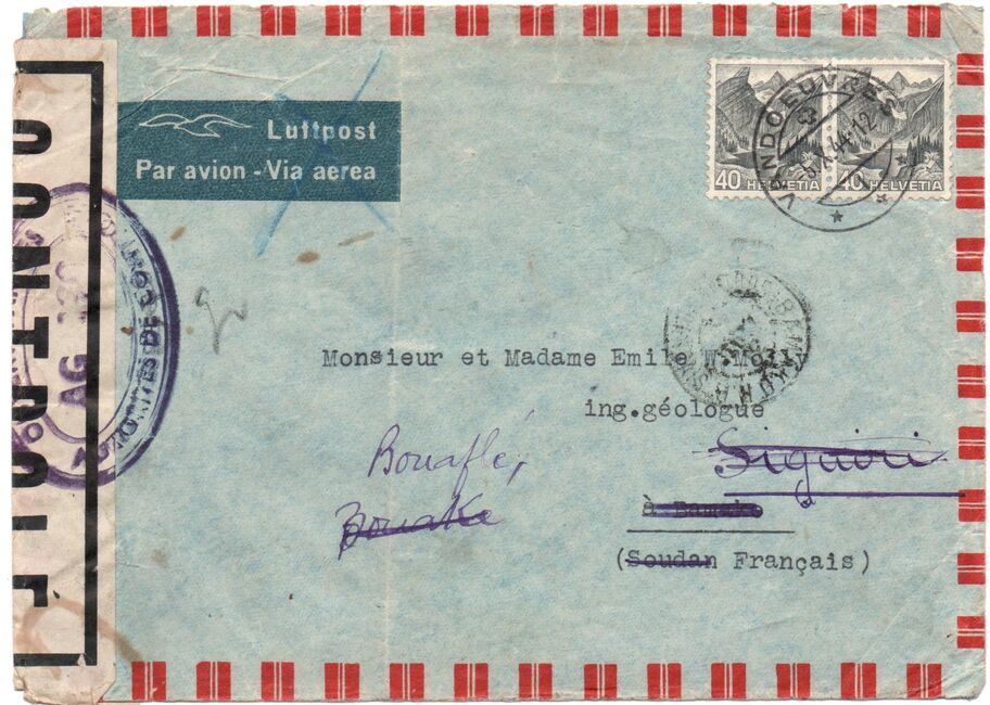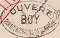 Lettre envoyée de Port-en-Bessin (Calvados) à une date difficilement lisible (peut-être 5 juin 1944), revêtue d'une double marque de contrôle britannique et française. La marque française est composée d'une bande de contrôle, d'un cachet rectangulaire 002 et de la marque ovale de la commission de Caen C-A.