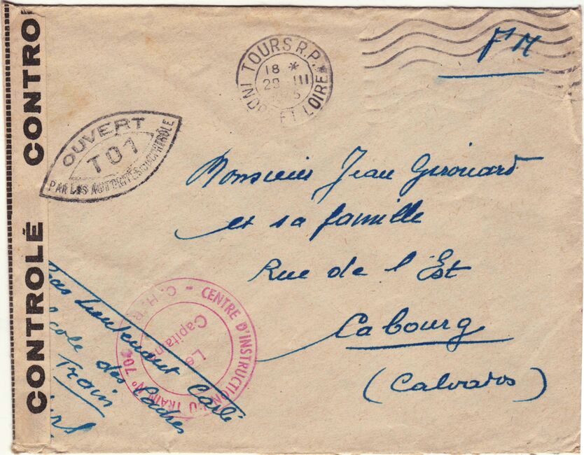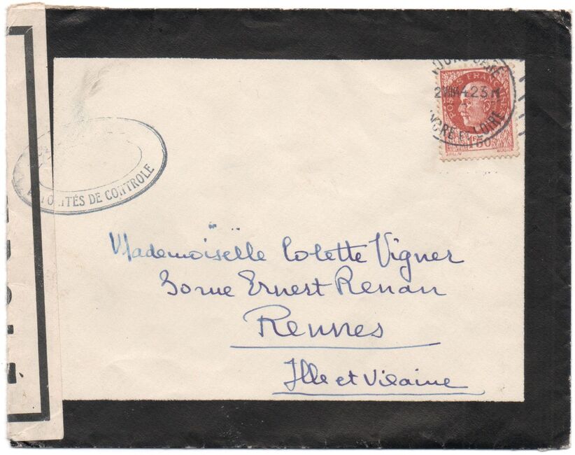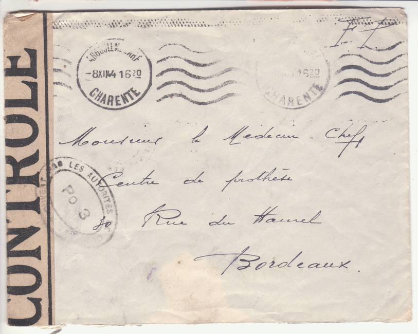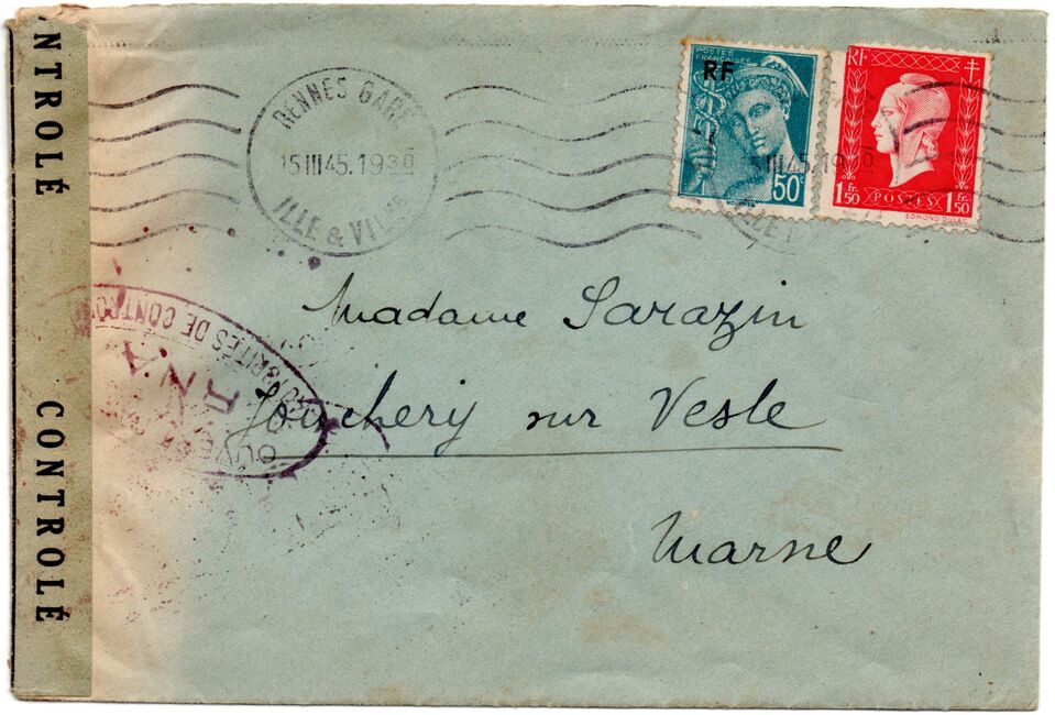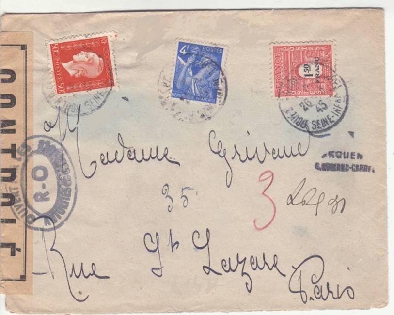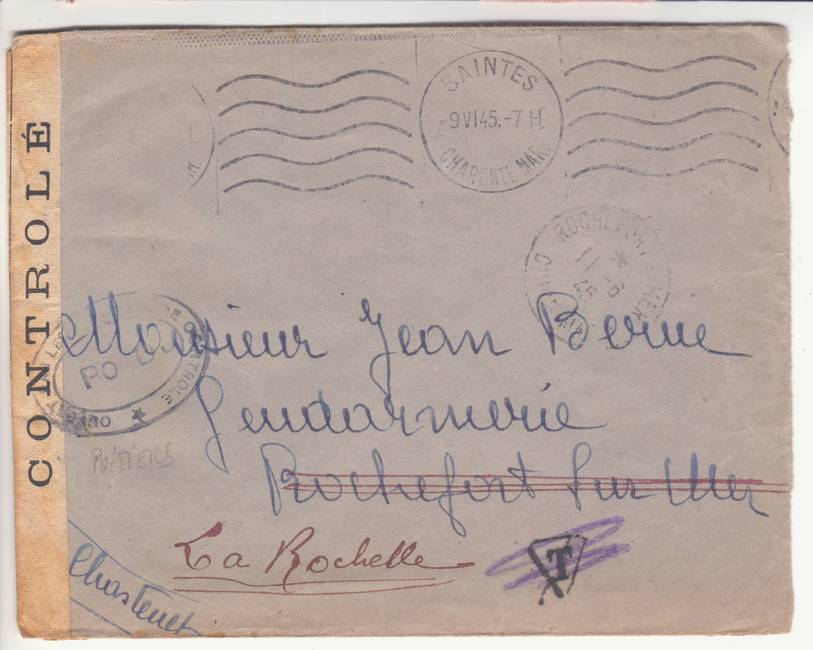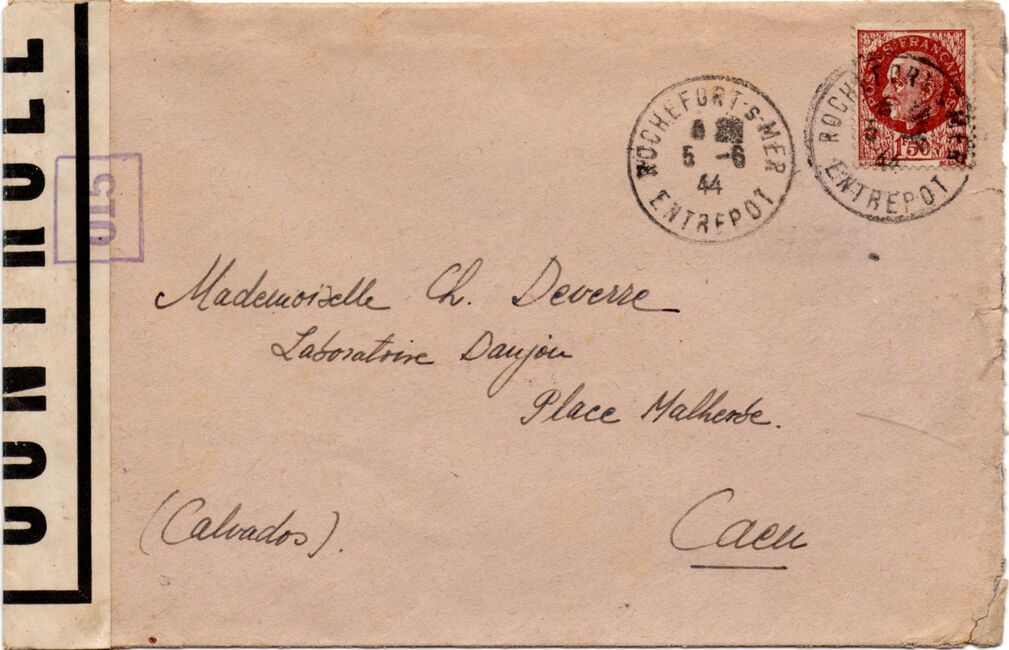 Lettre envoyée de Rochefort-sur-Mer la veille du débarquement allié de Normandie à destination de Caen, revêtue d'une bande de contrôle et des cachets 007 et 015 caractéristiques des premières marques de la Libération.