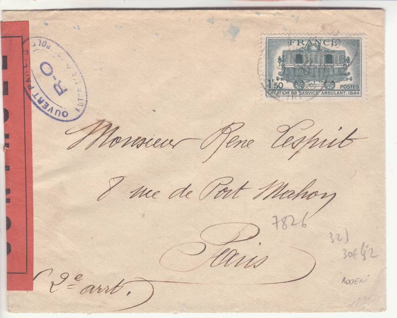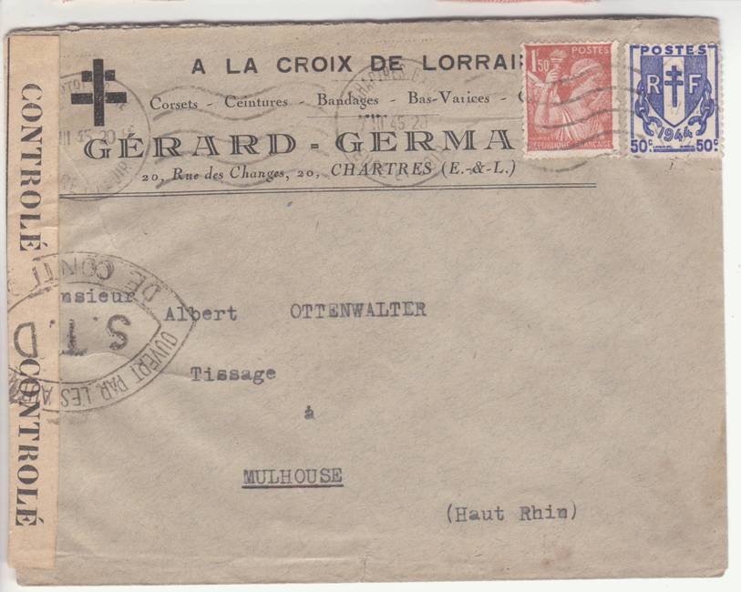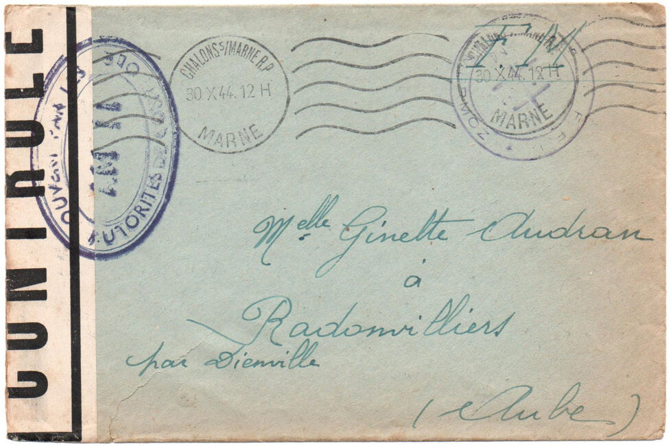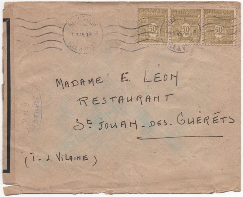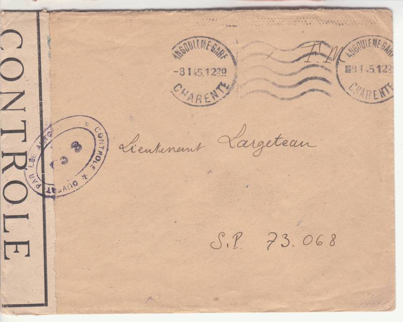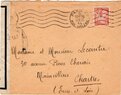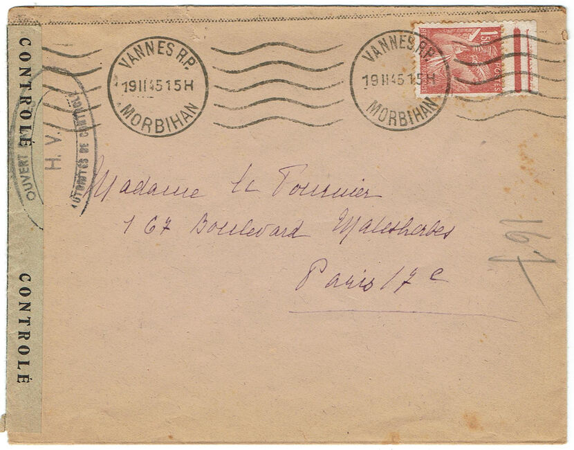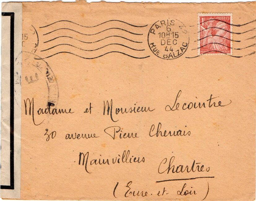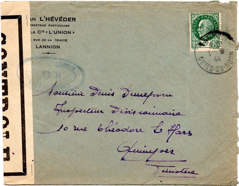 Lettre envoyée de Rochefort-sur-Mer la veille du débarquement allié de Normandie à destination de Caen, revêtue d'une bande de contrôle et des cachets 007 et 015 caractéristiques des premières marques de la Libération.