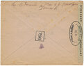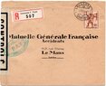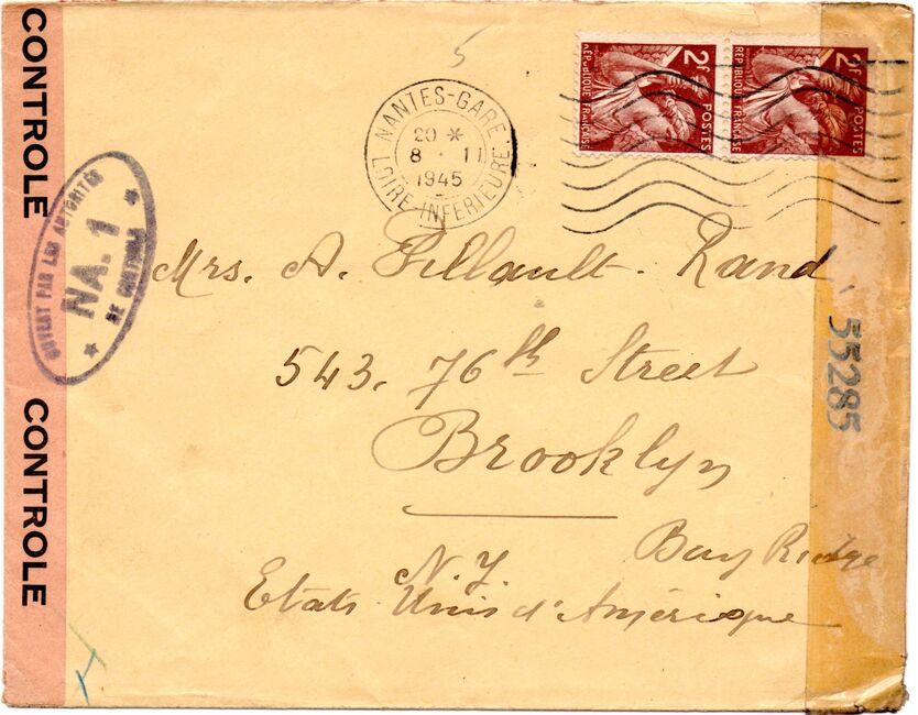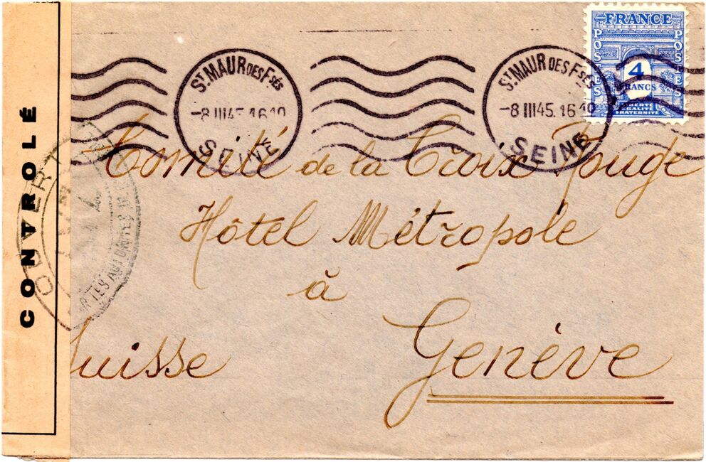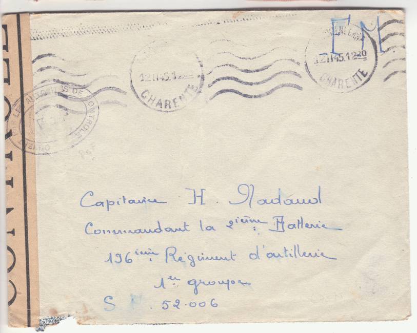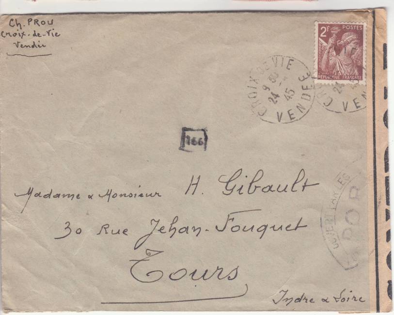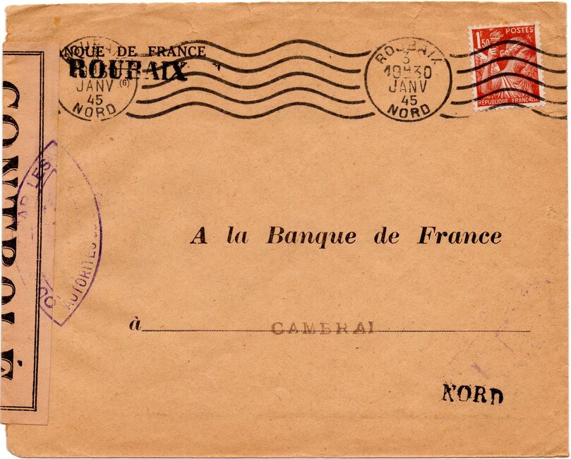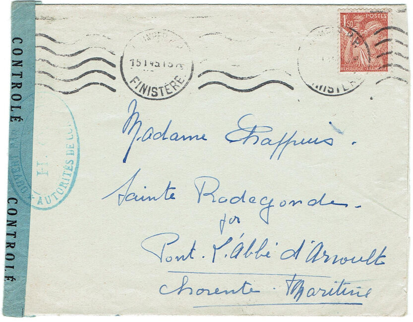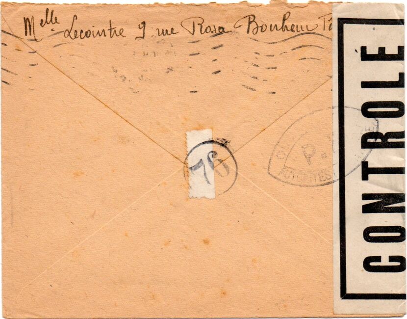 Lettre envoyée de Rochefort-sur-Mer la veille du débarquement allié de Normandie à destination de Caen, revêtue d'une bande de contrôle et des cachets 007 et 015 caractéristiques des premières marques de la Libération.