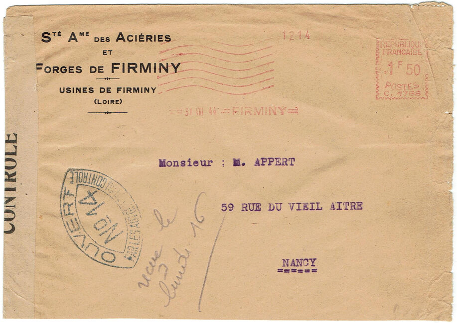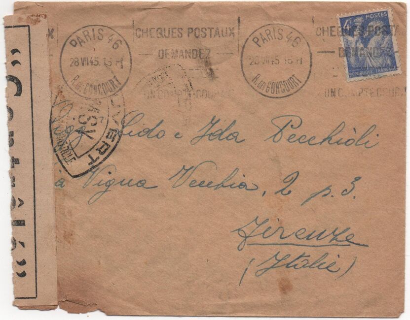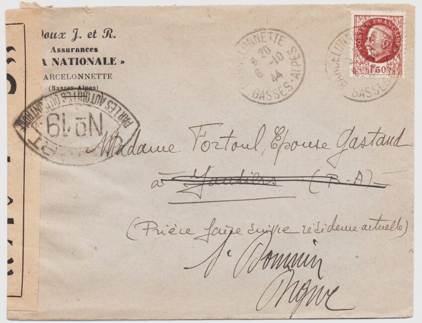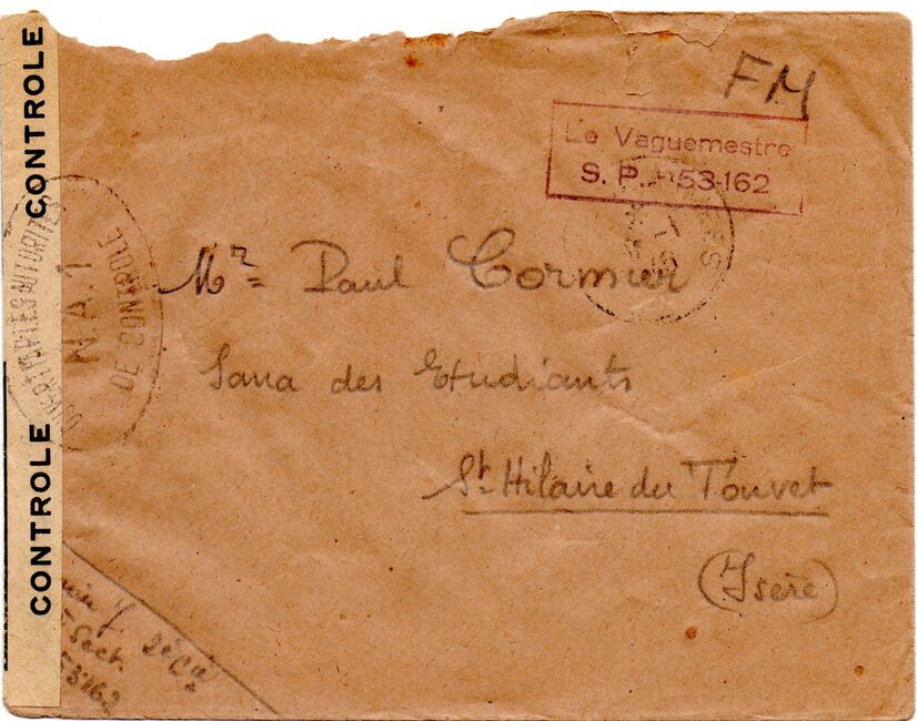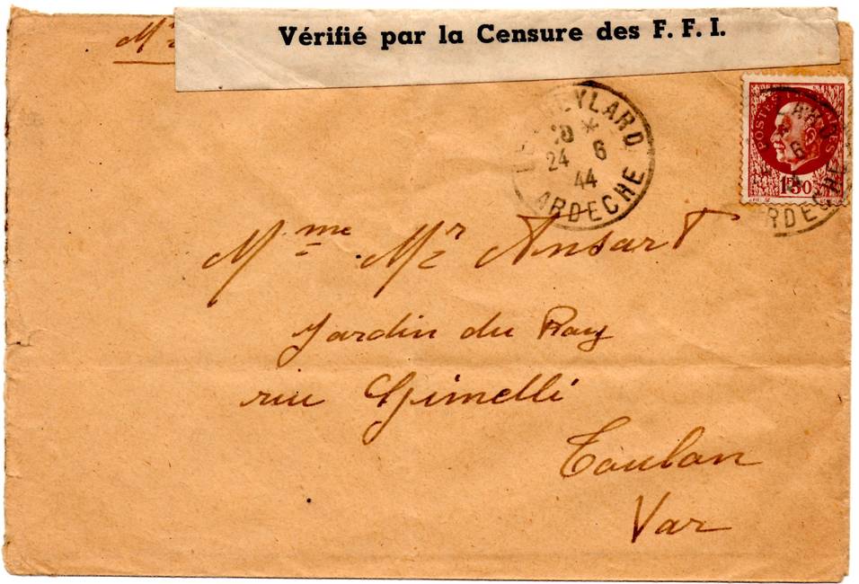 Lettre envoyée du Cheylard en Ardèche le 24 juin 1944, ouverte par la censure FFI qui a apposé une bande de contrôle spécifique utilisée localement. L'Ardèche a été libérée une première fois par la résistance intérieure avant d'être reprise par une contre-offensive allemande, puis libérée une seconde fois par l'Armée de Libération du 29 août au 1er septembre 1944.