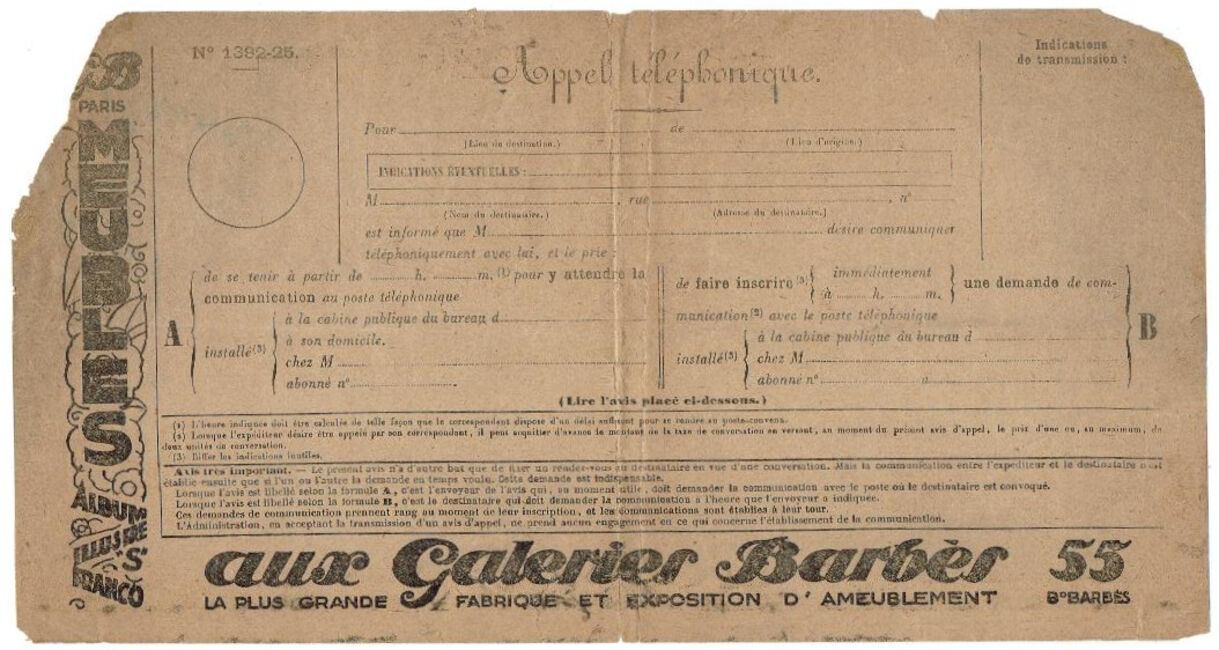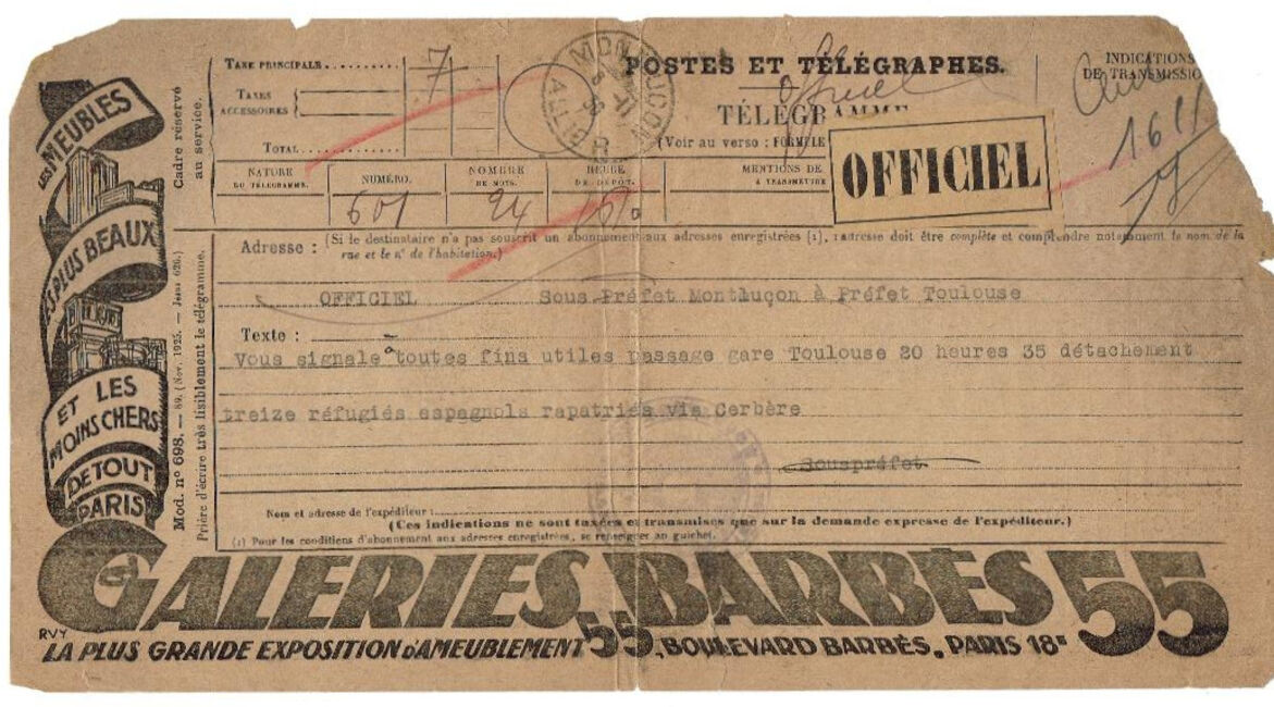 Bordereau de télégramme du 6 novembre 1936 envoyé par la sous-préfecture de Montluçon au Préfet de la Haute-Garonne à Toulouse signalant « à toutes fins utiles » le passage en gare de Toulouse d’un « détachement de treize réfugiés espagnols rapatriés via Cerbère ».