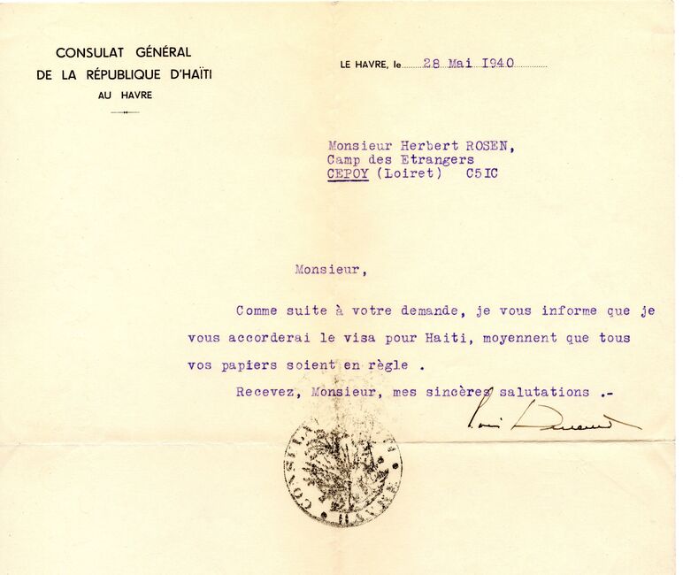Lettre envoyée le 30 mai 1940 du consulat général d'Haïti au Havre à destination d'un allemand interné civil au camp C5IC de Cépoy dans le Loiret. Le courrier est contrôlé par la commission UP qui a apposé un très rare cachet "acheminer d'urgence - commission UP". Le courrier concerne l'obtention d'un visa pour Haïti. Les internés avaient en effet la possibilité, après passage devant d'une commission dite de criblage, de quitter la France pour un pays allié ou non-belligérant.